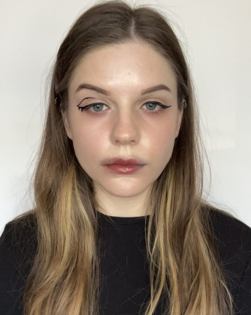 Dla jeszcze bardziej „brutalnego” efektu Ola roztarła narysowaną wcześniej kreskę. Zazwyczaj nie lubimy tego łzawego efektu, ale tu jest jak najbardziej pożądany. Dołóż do tego fioletowego cienia, a także doklej dramatycznie długie sztuczne rzęsy i voila – makijaż skończony i wygląda świetnie!