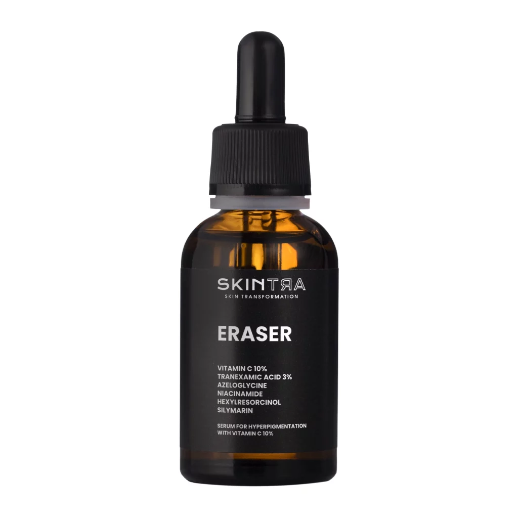 Pojemność: 30 ml | Formuła: lekko oleista, ale wciąż wodnista | Składniki aktywne: etylowana witamina C 10% (3-O-Ethyl Ascorbic Acid), kwas traneksamowy 3%, niacynamid, azeloglicyna, heksylorezorcynol, sylimaryna