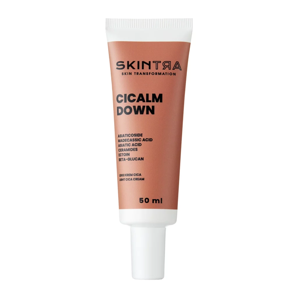 Wszystkie kremy z wyrazem Cica w nazwie, czyli ekstraktami z wąkrotki azjatyckiej można od ręki uznać za łagodzące. Ten od Skintra również koi i wycisza skórę, ale w przeciwieństwie do innych nie obciąża jej. Jest niekomedogenny, pozbawiony olejów i pozostawia satynowo-matowe wykończenie na skórze, dlatego sprawdzi się idealnie pod makijaż. Dodatkowo zawiera beta-glukan wraz z kompleksem regenerującym Bioceramidyl Pure, alantoiną i pantenolem odbudowują płaszcz hydrolipidowy skóry.