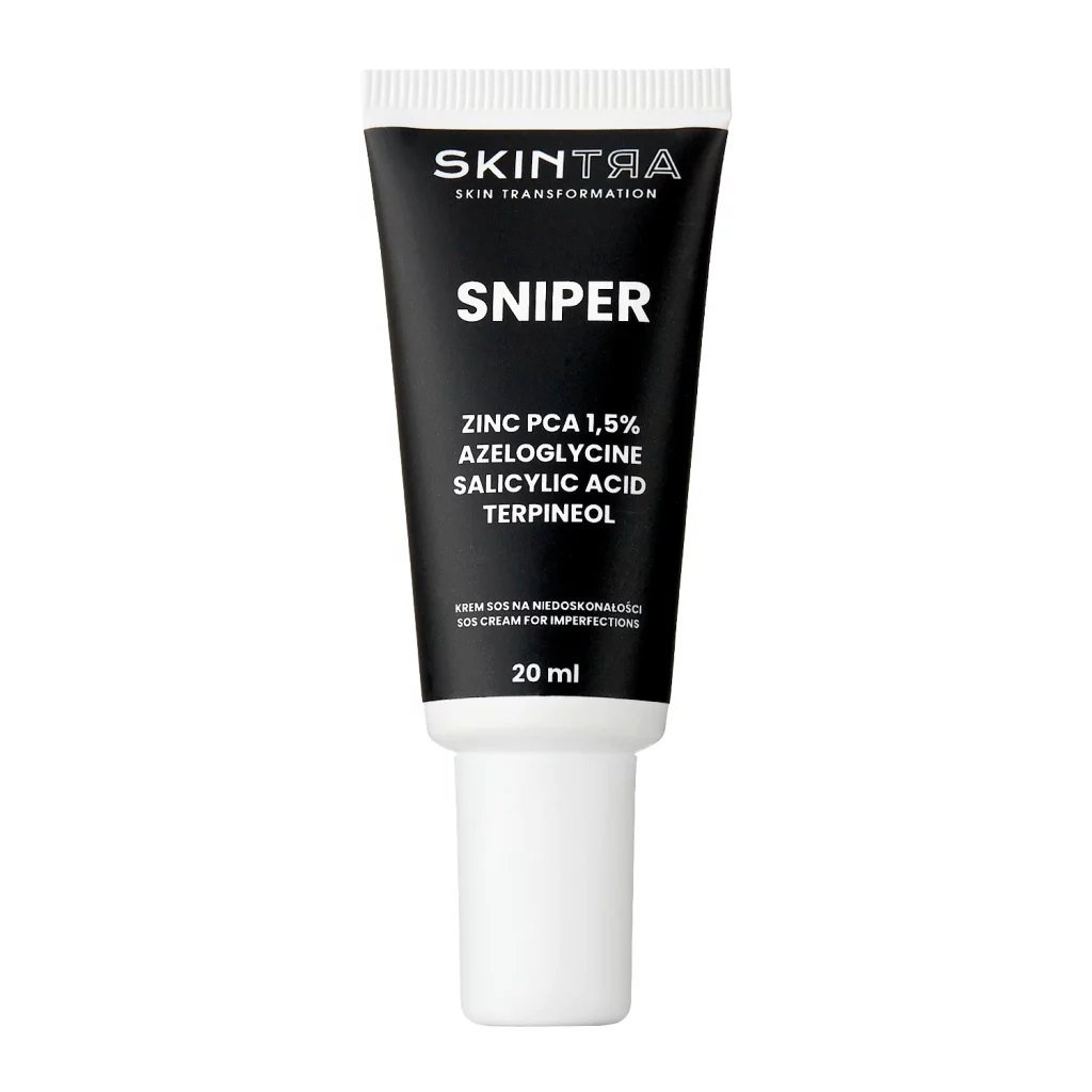 Zmagasz się z pojedynczymi niedoskonałościami, które pojawiają się w najmniej odpowiednim momencie? Sniper to coś dla Ciebie. Nazwa jest nieprzypadkowa – krem od SkinTra zaaplikowany na konkretne wypryski “rozbraja bomby”. Zawarty w nim cynk PCA hamuje rozwój bakterii, co zapobiega rozprzestrzenianiu się zmian. Niezrównany w rozpuszczaniu łoju kwas salicylowy oczyszcza ujścia gruczołów łojowych, więc działa również na zaskórniki. Azeloglicyna koi i zmniejsza zaczerwienienia, a unikatowy ekstrakt z porostu alpejskiego to bomba przeciwzapalna i przeciwbakteryjna. Krem można stosować również na zmiany na plecach, dekolcie, czy pośladkach. Po nałożeniu go na oczyszczoną skórę najlepiej chwilę zaczekać – kiedy zastygnie, stworzy gojącą warstwę okluzyjną, a przy tym nie pobrudzi ubrań lub pościeli.