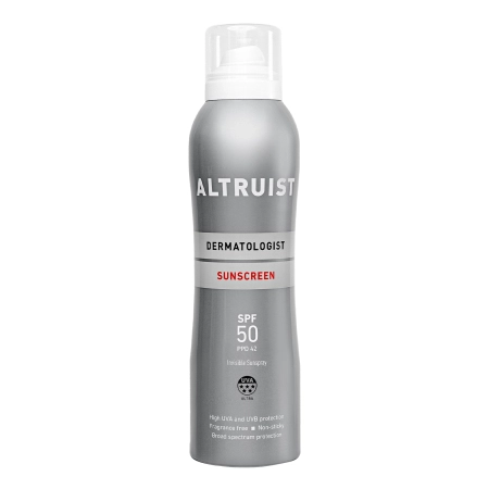 Altruist - Invisible Sunspray SPF50 - wodoodporny spray zawierający filtry chemiczne, które chronią skórę przed promieniowaniem UV. Octan witaminy E, jako stabilna pochodna tokoferolu, czyli witaminy E, działa antyoksydacyjnie, chroni przed szkodliwym działaniem wolnych rodników. Produkt przeznaczony jest do skóry ciała. Odpowiedni dla wegan.