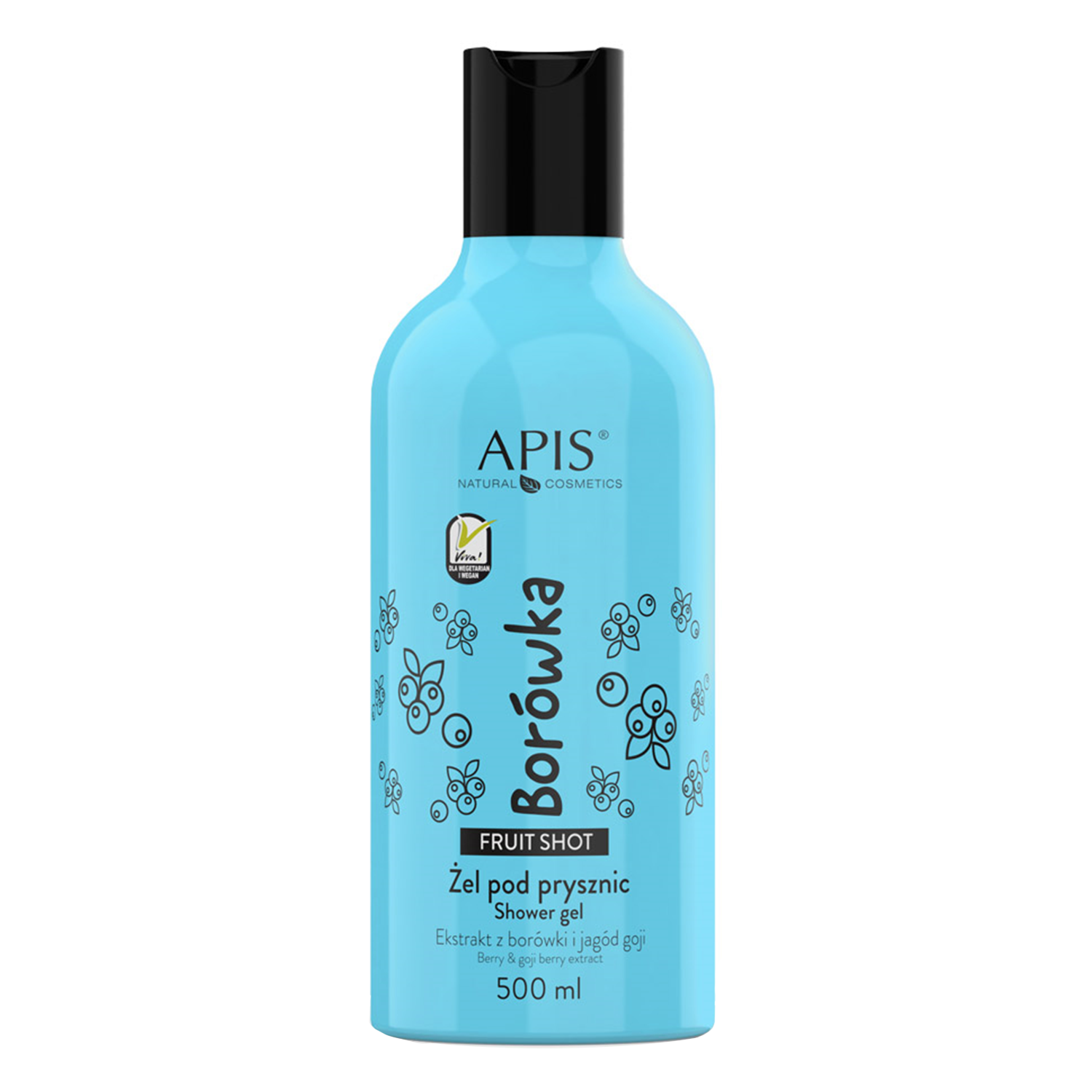 Apis - Fruit Shot - Borówkowy Żel po Prysznic - żel pod prysznic do każdego rodzaju skóry, który skutecznie oczyszcza, jednocześnie uelastyczniając i regenerując skórę, za sprawą ekstraktu z arktycznych owoców i ekstraktu z jagód goji. Dzięki dodatkowi kwasu hialuronowego produkt działa również nawilżająco. Posiada przyjemny zapach borówek i jagód, jest naturalny i odpowiedni dla wegan.