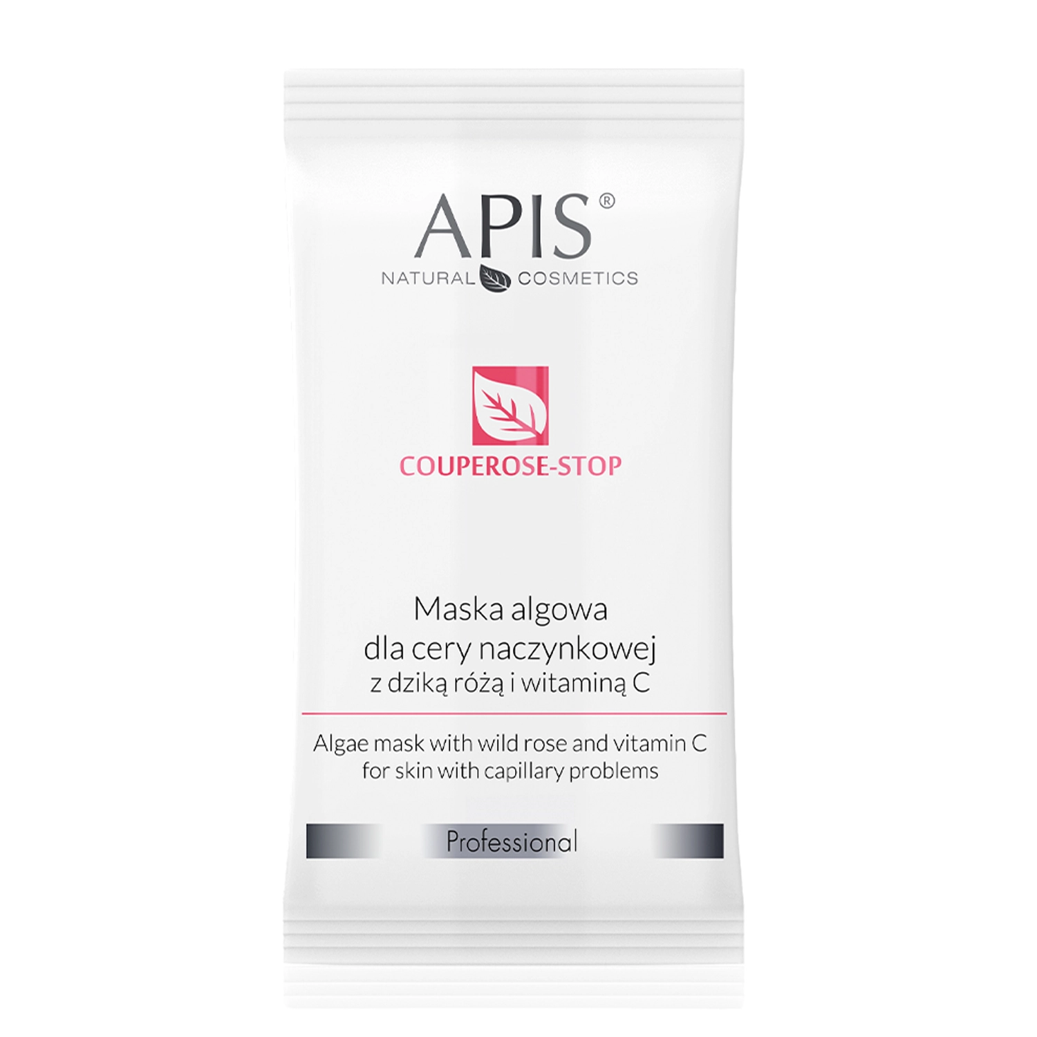 Apis - Couperose-Stop - Maska Algowa dla Cery Naczynkowej z Dziką Różą i Witaminą C - maska algowa do skóry naczyniowej. Ma postać proszku, który po dodaniu wody przybiera postać gęstej, gładkiej maseczki. Zawiera nawilżający alginian oraz składniki takie jak ekstrakty z dzikiej róży, z arniki oraz witaminę C, które wpływają na wzmacnianie naczyń krwionośnych, a także łagodzenie reaktywnej skóry i ochronę antyoksydacyjną. Kosmetyk naturalny.