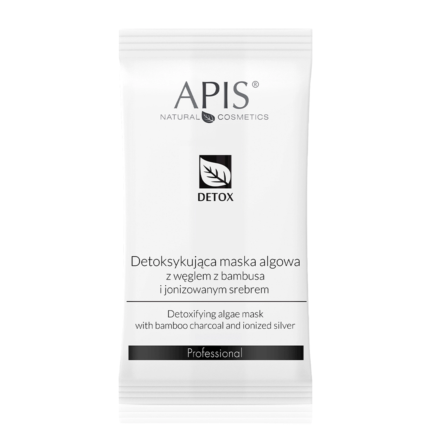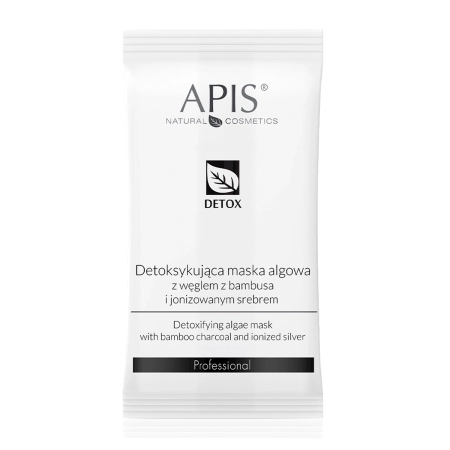 Apis - Detox - Detoksykująca Maska Algowa z Węglem z Bambusa i Jonizowanym Srebrem - czarna maska algowa do skóry trądzikowej, tłustej, mieszanej i z zaskórnikami. Ma postać proszku, który po dodaniu wody przybiera postać gęstej, gładkiej maseczki. Zawiera nawilżający alginian, matujący aktywny węgiel z bambusa oraz składniki antybakteryjne, jak jonizowane srebro czy ekstrakty z irysa florenckiego i z czystka. Dodatkowo ekstrakty z bambusa i z zielonej herbaty łagodzą podrażnioną skórę. Maska wycisza stany zapalne, a dodatkowo nawilża i matuje skórę. Kosmetyk naturalny.