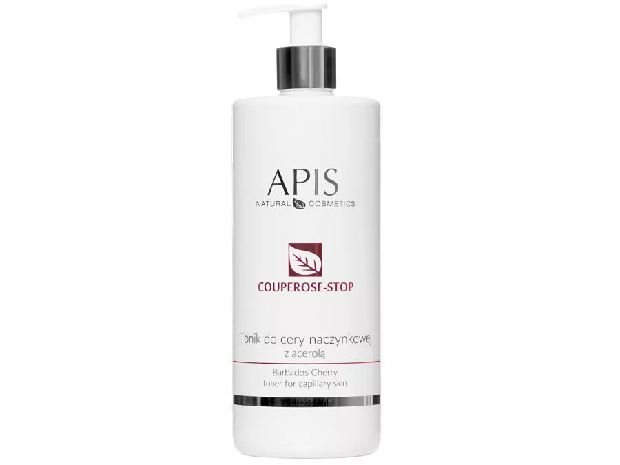 Apis - Professional - Couperose-Stop - Barbados Cherry Toner for Capillary Skin - Tonik do Cery Naczynkowej z Acerolą - zawiera ekstrakt z aceroli - silny antyoksydant, o dużej zawartości witaminy C, który działa nawilżająco, uelastyczniająco oraz poprawia koloryt cery. Ponadto obecna w produkcie witamina C w postaci glukozydu askorbylu, rozjaśnia przebarwienia i neutralizuje wolne rodniki, opóźniając procesy starzenia skóry, a ekstrakt z dzikiej róży chroni ją przed szkodliwym działaniem wolnych rodników, wzmacnia naczynia włosowate oraz działa nawilżająco i wygładzająco. W składzie znajdziemy także pantenol, który łagodzi podrażnienia i nawilża skórę. Kosmetyk naturalny.