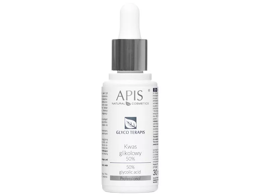 Apis - Professional - Glyco Terapis - Glycolic Acid - Kwas Glikolowy 50% - preparat eksfoliujący z 50% kwasem glikolowym o pH 1,5. Posiada szerokie spektrum działania - złuszcza warstwę rogową naskórka, wygładza blizny potrądzikowe, wspomaga odnowę i regenerację skóry właściwej. Sprawia, że skóra staje się wygładzona i odświeżona. Nadaje skórze zdrowy, świeży koloryt. Ponadto zwiększa absorpcję stosowanych kosmetyków pielęgnacyjnych. Kosmetyk naturalny.