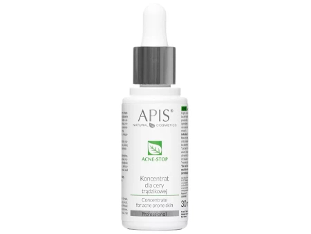 Apis - Professional - Acne-Stop - Concentrate for Acne Prone Skin - Koncentrat dla Cery Trądzikowej - koncentrat dla cery trądzikowej zawierający ekstrakt z zielonej herbaty o działaniu oczyszczającym i przeciwzapalnym oraz ekstrakt z alg morskich, który łagodzi podrażnienia, wzmacnia barierę ochronną skóry, intensywnie nawilża. Obecność ekstraktu z kiwi działa antyoksydacyjnie, regenerująco i wygładzająco dzięki dużej zawartości witaminy C. Z kolei ekstrakt z aloesu dba o odpowiednie nawilżenie skóry oraz łagodzi podrażnienia i zaczerwienienia. Kosmetyk naturalny.