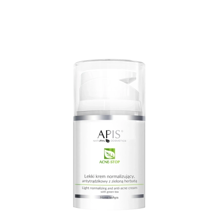 Apis - Home Terapis - Acne-Stop - Light Normalizing and Anti-Acne Cream with Green Tea - krem o lekkiej, łatwo wchłaniającej się konsystencji. Jest ukierunkowany na działanie naprawcze i regeneracyjne. Każda skóra potrzebująca regeneracji np. po walce z trądzikiem czy po nadmiernym wysuszeniu może być z tego kremu zadowolona. Formuła jest oparta na odżywczym oleju słonecznikowym. Stanowi on bazę dla dobroczynnych regenerujących składników aktywnych takich jak: ceramid, karnityna, tripeptyd czy też pantenol. Mieszanka tych substancji istotnie wspiera skórę w codziennej odbudowie i fizjologii. Krem jest wzbogacony o hialuronian sodu, który stanowi nawilżenie dla skóry, a hydrolizat z jedwabiu delikatnie otacza skórę, kojąc ją i zapobiegając nadmiernej utracie wody, szczególnie w przypadku mocno wysuszonej cery jest to znaczące. Krem zawiera też ekstrakt z zielonej herbaty działający kojąco i łagodząco oraz będący bogaty w związki antyoksydacyjne. Kosmetyk naturalny.