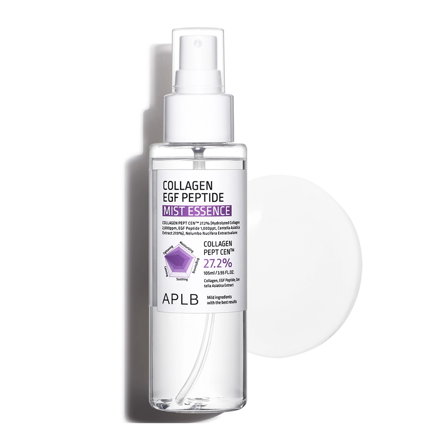 APLB - Collagen EGF Peptide Mist Essence - esencja do twarzy w wygodnym opakowaniu z atomizerem, który rozpyla delikatną mgiełkę. Formuła na bazie opatentowanego składnika Collagen Pept Cen™ zawiera wodę z wąkroty azjatyckiej, sh-Oligopeptide-1 oraz hydrolizowany kolagen. Tak stworzona kompozycja składników aktywnych wpływa znacząco na poprawę bariery naskórkowej, wspomaga regenerację skóry, nawilża i przynosi ukojenie cerze podrażnionej. Dodatek pantenolu poprawia właściwości przeciwzapalne produktu, a skwalan wspomaga przenikanie pozostałych składników, a także odżywia. Esencja nie zawiera dodatkowych kompozycji zapachowych, a jej pH jest lekko kwaśne - 5.0 do 6.5.