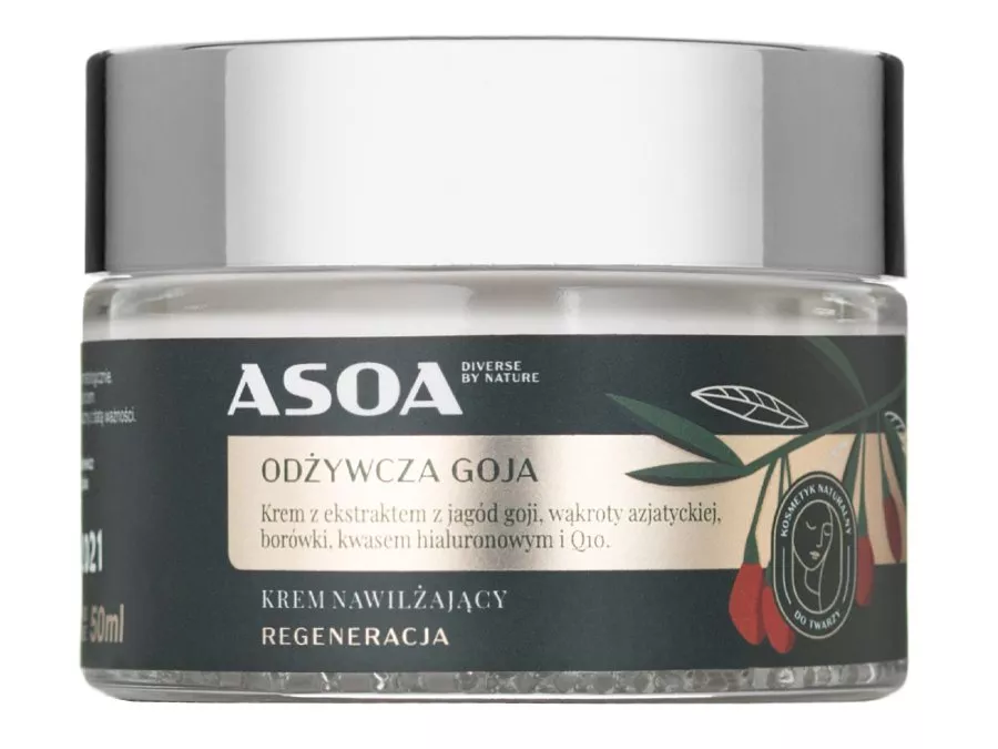 Asoa - Odżywcza Goja - Krem Do Twarzy - krem do twarzy o działaniu nawilżającym i regenerującym. Za odpowiednie nawilżenie odpowiedzialne są wody kwiatowe. Hydrolat różany łagodzi podrażnienia i zaczerwienienia, natomiast hydrolat z kwiatu manuka działa antyseptycznie. Alantoina