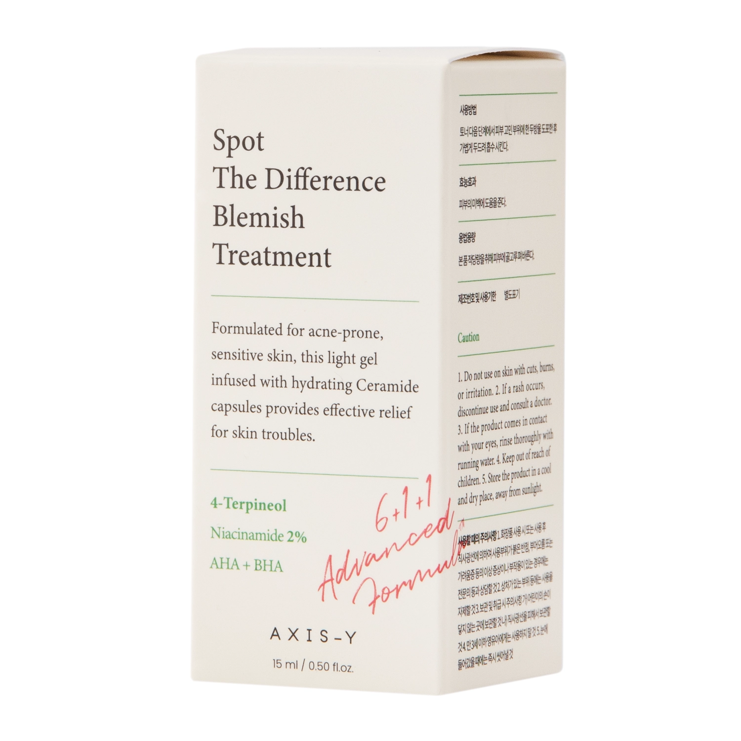 Axis-y - Spot the Difference Blemish Treatment - serum do twarzy przeciw niedoskonałościom. Zawiera kompozycję składników o działaniu przeciwbakteryjnym, łagodzącym oraz przeciwzapalnym. Ma żelową konsystencję, która została wzbogacona o regenerujące ceramidy. Zawiera olejek z drzewa herbacianego, który znany jest z właściwości przeciwtrądzikowych. Niacynamid w stężeniu 2% działa przeciwzapalnie oraz rozjaśnia ślady po niedoskonałościach. Połączenie kwasów AHA i BHA (glikolowego i salicylowego) wspomaga redukcję wyprysków. Liczne ekstrakty roślinne, m.in. z zielonej herbaty działają łagodząco i regulująco. Produkt zawiera dodatek substancji nawilżających, które dbają o barierę ochronną skóry. Może być stosowany w pielęgnacji cery wrażliwej, skłonnej do niedoskonałości. Produkt jest naturalny.