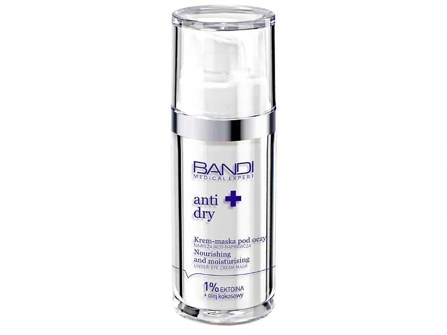 Bandi - Medical Expert - Anti Dry - Nourishing and Moisturising under -Eye Cream Mask - kremo - maska pod oczy przeznaczona do codziennej pielęgnacji. Występujący w składzie kosmetyku olej kokosowy, dzięki zawartości wielu cennych składników takich jak: witaminy, wapń, kwas foliowy, potas, magnez, cynk fospor czy żelazo, będzie poprawiać poziom odżywienia skóry. Natomiast dodatek kwasu hialuronowego i ektoiny nawilży skórę, a masło shea pozostawi ją miękką w dotyku. Zawarty w produkcie olej buriti zniweluje szkodliwe działanie wolnych rodników, które przyczyniają się do przedwczesnego starzenia się skóry.