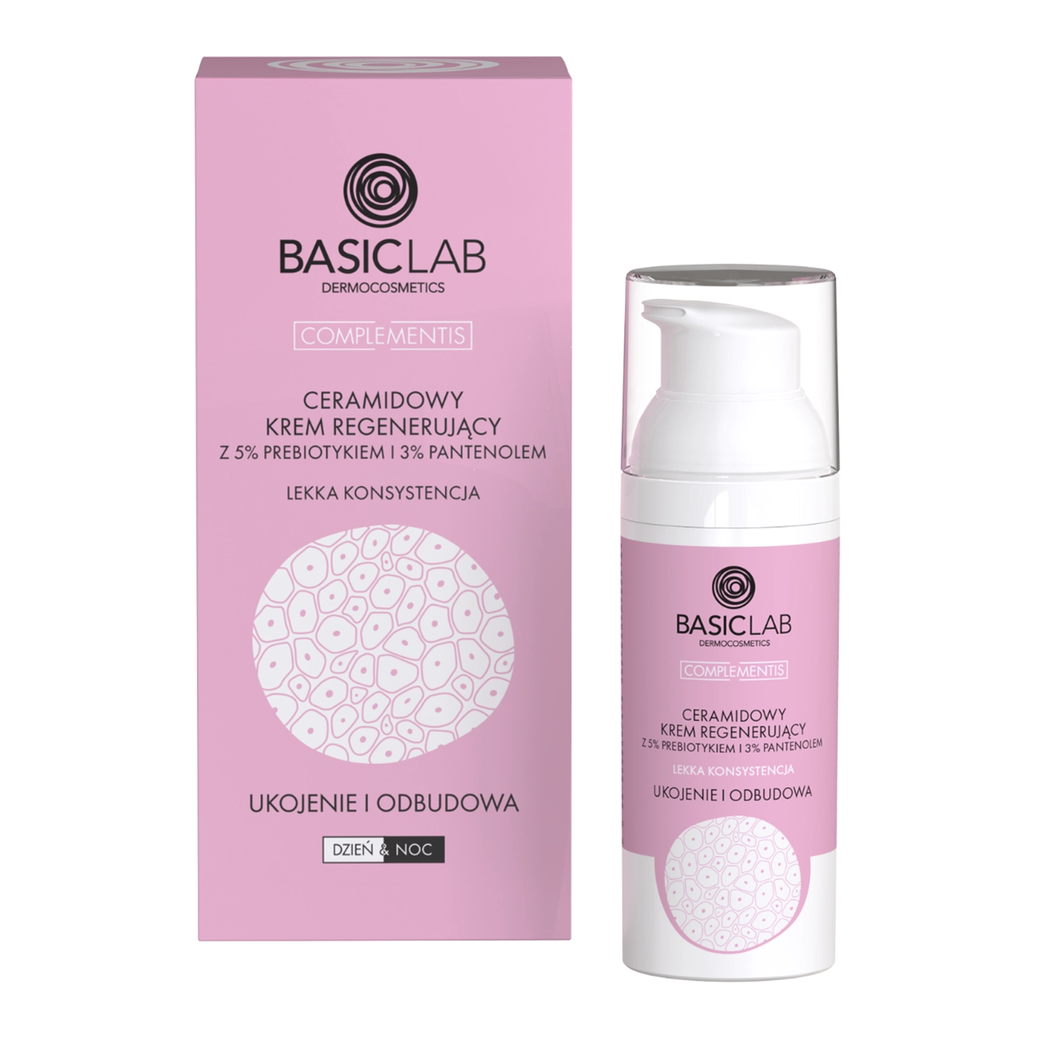 BasicLab - Complementis - Ceramidowy Krem Regenerujący o Lekkiej Konsystencji z Prebiotykiem i Pantenolem - przeznaczony do codziennego stosowania w porannej i wieczornej pielęgnacji, dba o prawidłowe funkcjonowanie bariery hydrolipidowej. Zawiera ceramidy, które wzmacniają barierę ochronną skóry, regenerują i chronią przed przesuszeniem. 5% prebiotyk przywraca równowagę mikrobiomu, koi i łagodzi podrażnienia oraz stany zapalne. Z kolei 3% pantenol wykazuje działanie gojące, łagodzące podrażnienia i nawilżające, zmniejsza utratę wody przez naskórek i skutecznie nawilża skórę, nadając jej miękkość i elastyczność. Alantoina koi i łagodzi podrażnienia, a niacynamid wzmacnia barierę ochronną skóry, działa rozjaśniająco i przeciwzapalnie. Dodatek mocznika i argininy wzmacnia działanie nawilżające produktu. Krem nie pozostawia tłustego filmu. Może być stosowany przez kobiety karmiące piersią oraz kobiety w ciąży, a także u dzieci od 3 roku życia.