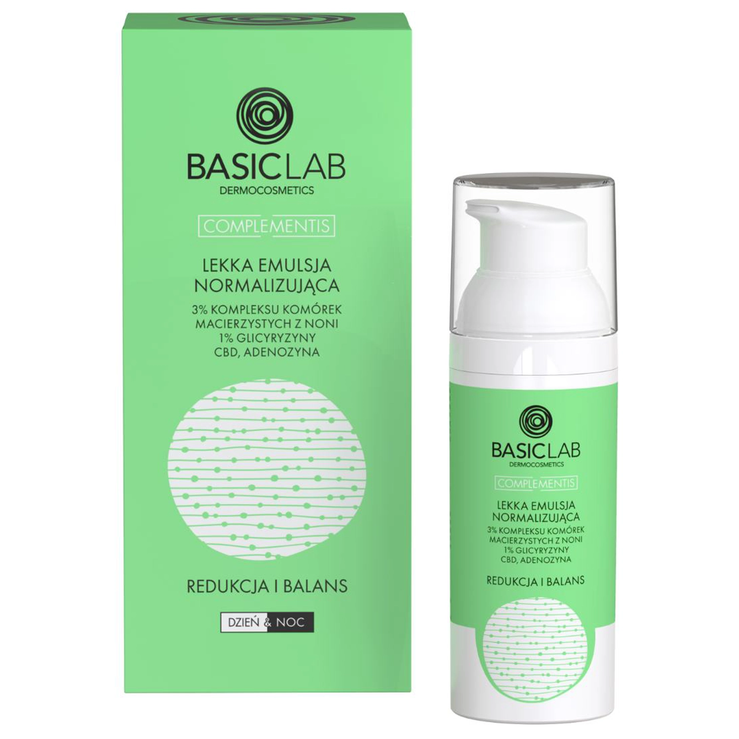 BasicLab - Redukcja i Balans - Lekka Emulsja Normalizująca 3% Kompleksu Komórek Macierzystych z Noni, 1% Glicyryzyny, CBD i Adenozyna - emulsja do twarzy, przeznaczona do porannej i wieczornej pielęgnacji skór mieszanych, tłustych oraz trądzikowych. Lekka konsystencja szybko się wchłania i pozostawia satynowe wykończenie. Jego formułę skomponowano z 3% kompleksu komórek macierzystych z noni, które wraz CBD oraz sarkozyną normalizują wydzielanie sebum, redukują zmiany trądzikowe oraz zapobiegają ich powstawaniu. Glicyryzyna w stężeniu 1% działa normalizująco oraz wyrównuje koloryt skóry, a trehaloza dba o nawilżenie. Krem zmniejsza widoczność porów i wygładza strukturę skóry. Jest przyjazny weganom oraz nie zawiera kompozycji zapachowej.