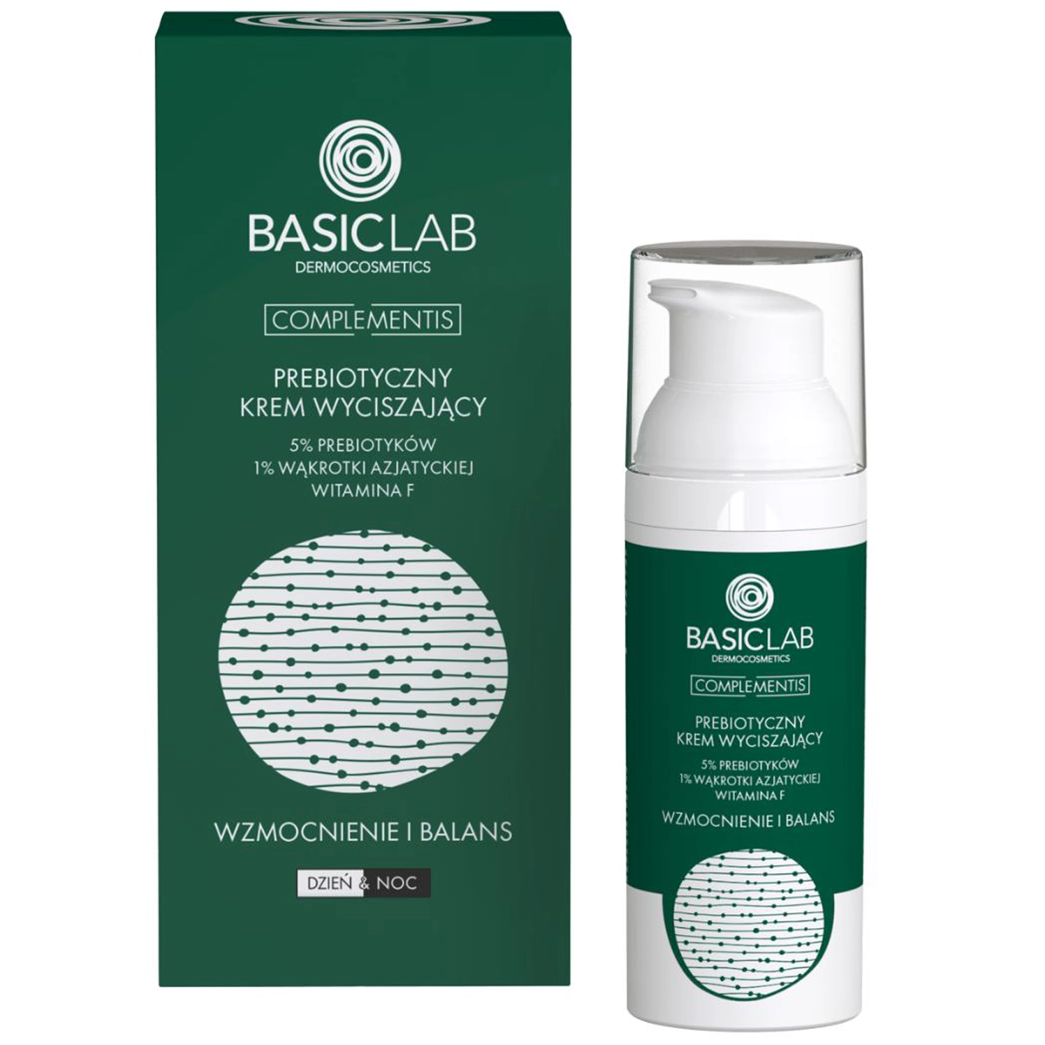 BasicLab - Wzmocnienie i Balans - Prebiotyczny Krem Wyciszający z 5% Prebiotyków, 1% Wąkrotki Azjatyckiej i Witamina F - krem do twarzy, przeznaczony do porannej i wieczornej pielęgnacji skór mieszanych, tłustych, wrażliwych i z niedoskonałościami. Lekka konsystencja nie obciąża skóry i pozostawia półmatowe wykończenie. W składzie zawarto między innymi 5% prebiotyków, które przywracają balans mikrobiomu, zapewniają skórze komfort, koją i łagodzą podrażnienia. Ekstrakt z wąkroty azjatyckiej oraz składniki pochodzące z rośliny (madekasozyd, azjatykozyd) dbają o pobudzenie procesów regeneracji i zapobiegają powstawaniu blizn potrądzikowych. Dodatek ceramidów działa odżywczo i ochronnie, a resweratrol chroni przed szkodliwym działaniem wolnych rodników. Z kolei witamina F wzmacnia barierę hydrolipidową i reguluje wydzielanie sebum. Kosmetyk jest przyjazny weganom oraz nie zawiera kompozycji zapachowej.