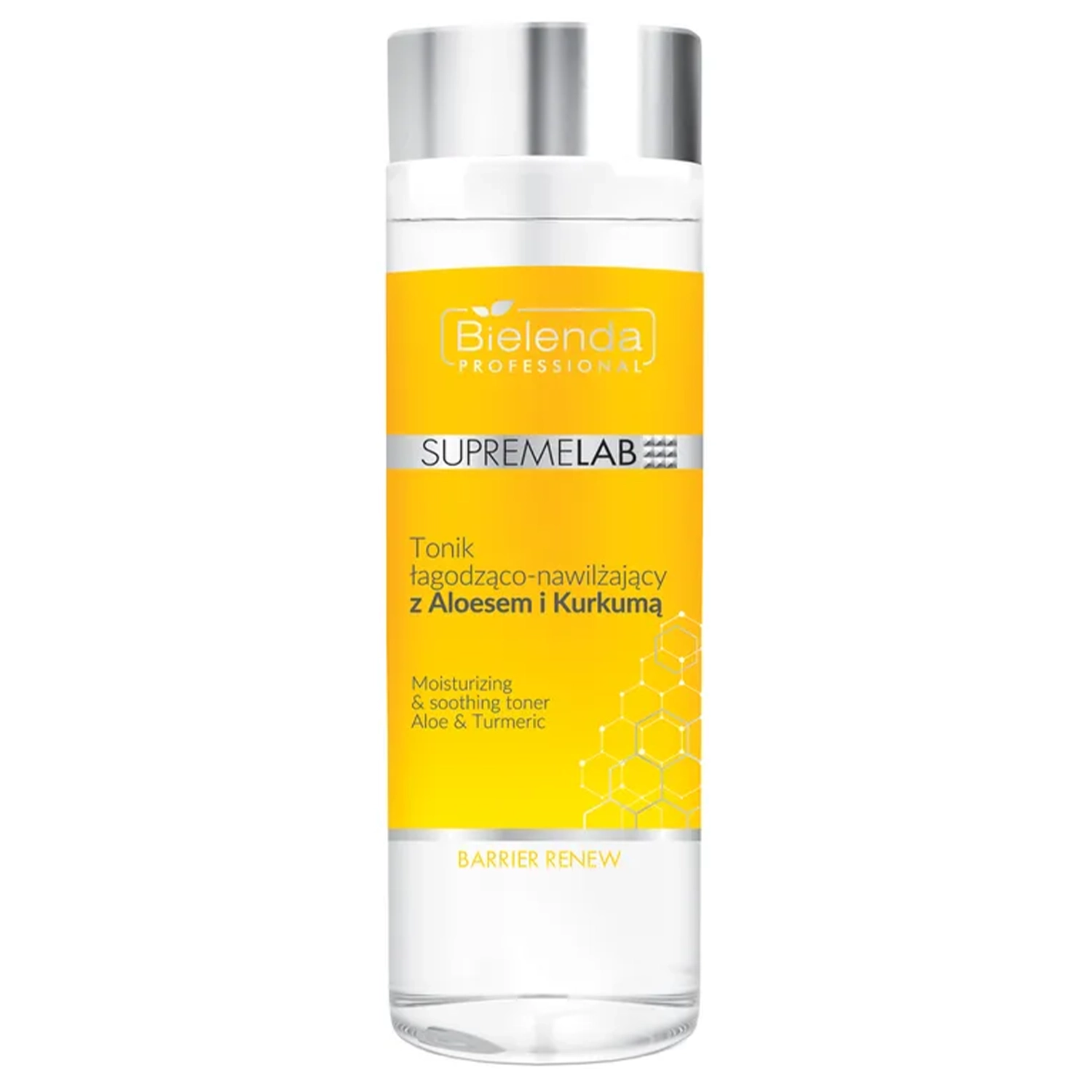 Bielenda Professional - Supremelab - Barrier Renew - Moisturizing&Soothing Toner Aloe&Turmeric - Tonik Łagodząco-Nawilżający z Aloesem i Kurkumą - tonik łagodząco-nawilżający. W jego składzie znajdziemy puder aloesowy, który nawilża, łagodzi podrażnienia i zaczerwienienia oraz kurkumę o właściwościach silnie antyoksydacyjnych. Niacynamid łagodzi, wspomaga regenerację i działa przeciwzmarszczkowo. Z kolei kwas hialuronowy w postaci Sodium Hyaluronate, wiąże wodę utrzymując odpowiedni poziom nawilżenia skóry, a piroglutaminian argininy silnie nawilża oraz wygładza skórę.