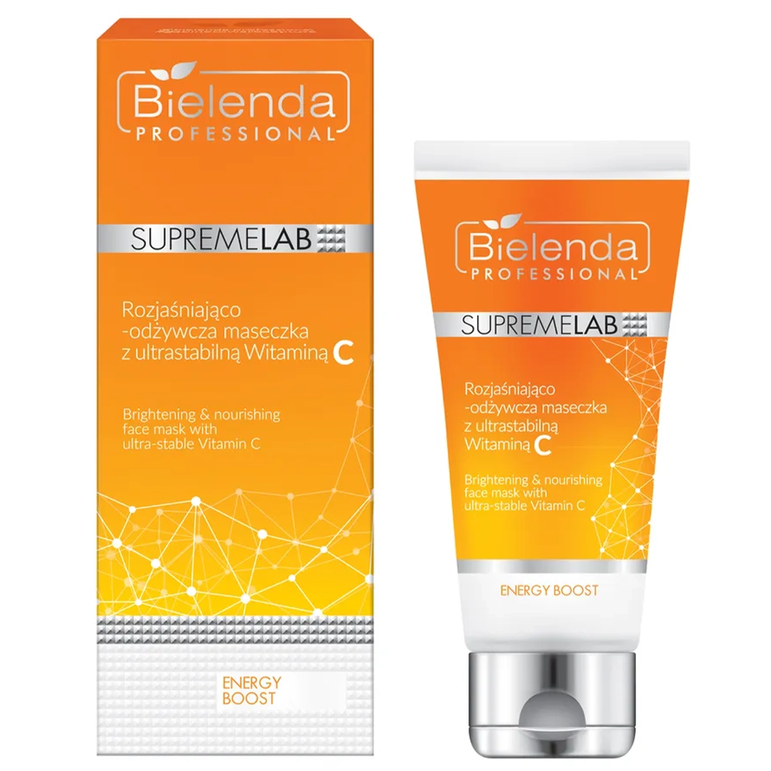 Bielenda Professional - Supremelab - Energy Boost - Brightening&Nourishing Face Mask with Ultra-Stable Vitamin C - maseczka ze stabilną formą witaminy C, która działa antyoksydacyjnie, wyrównuje koloryt skóry i działa przeciwstarzeniowo. Olej kokosowy zmiękcza i uelastycznia skórę oraz chroni ją przed efektem ściągnięcia, betaina zwiększa poziom nawilżenia w naskórku, a witaminy A i E zwalczają wolne rodniki. Maska intensywnie nawilża, zmiękcza i rozjaśnia, dając efekt skóry pełnej blasku.