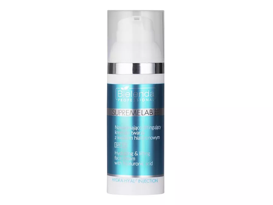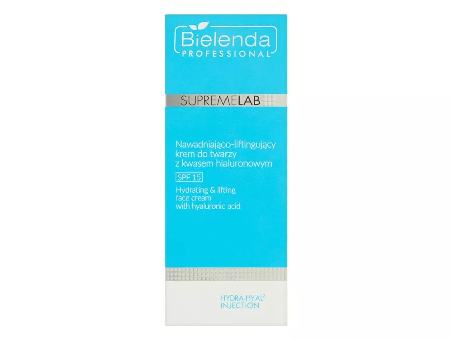 Bielenda Professional - Supremelab Hydra-Hyal Injection - Hydrating&Lifting Face Cream with Hyaluronic Acid SPF15 - Nawadniająco-Liftingujący Krem do Twarzy z Kwasem Hialuronowym - krem szczególnie polecany dla skóry dojrzałej, suchej, odwodnionej. Zawiera masło kakaowe, olej kokosowy i olej awokado, które zapobiegają utracie wody, odżywiają i chronią przed działaniem czynników zewnętrznych. Obecność filtrów chemicznych chroni przed promieniowaniem UV. Hialuronian sodu i kwas hialuronowy działają silnie nawilżająco poprzez wiązanie wody w naskórku. Dodatek hydrolizowanych glikozaminoglikanów działa zmiękczająco, nawilżająco, wygładza drobne zmarszczki i zwiększa elastyczność skóry, a argirelina działa przeciwzmarszczkowo.