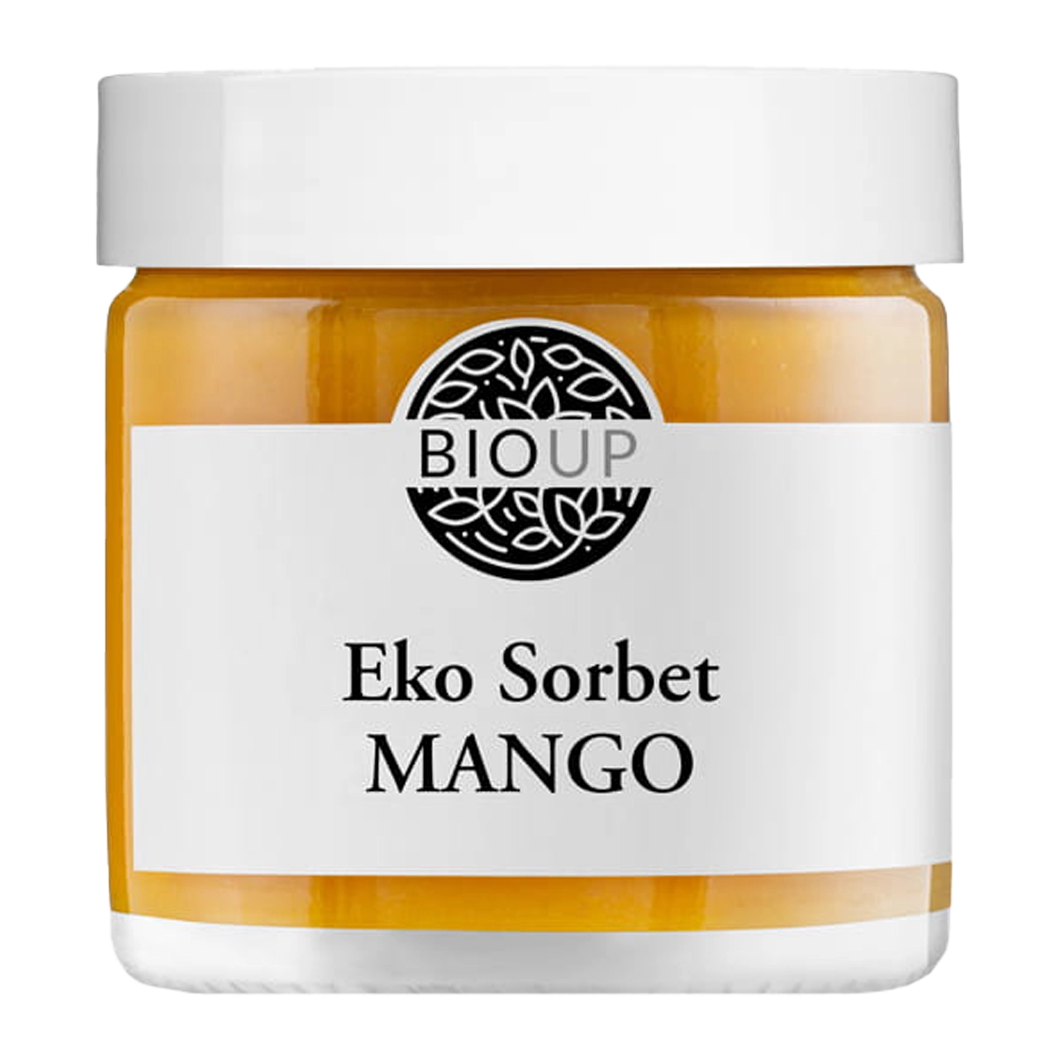 Bioup - Eko Sorbet Mango - Odżywczy Krem Olejowy z Jojobą, Rokitnikiem i Witaminą E - ręcznie robiony olejowy mus-krem powstały na bazie dwóch ekologicznych maseł o wyjątkowych właściwościach regenerujących i odżywczych - masła z pestek mango i masła shea. Formuła produktu została wzbogacona o oleje, tj. olej arganowy, olej sezamowy i olej z owoców rokitnika, które zmiękczają i wygładzają skórę. Produkt zawiera 92% składników ekologicznych. Sorbet ma zbitą konsystencję, która w zetknięciu z ciepłem skóry upłynnia się, dzięki czemu łatwo się rozprowadza.