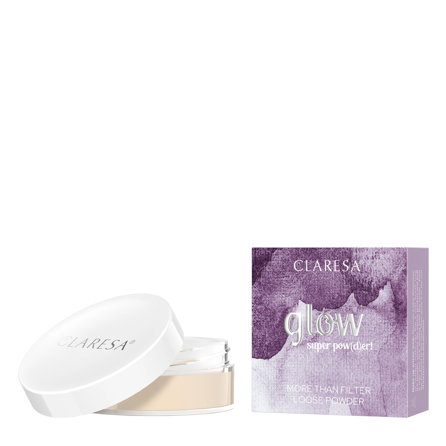 Claresa - Glow Super Pow(d)er - Puder Sypki - rozświetlający, sypki puder do twarzy. Zapewnia zdrowe, świetliste wykończenie. Subtelnie rozświetla oraz optycznie wygładza drobne zmarszczki, rozszerzone pory i nierówności. Ma transparentną, drobno zmieloną formułę. Doskonale wykańcza makijaż oraz przedłuża jego trwałość. Ma lekką konsystencję i zawiera delikatne, odbijające światło drobinki.