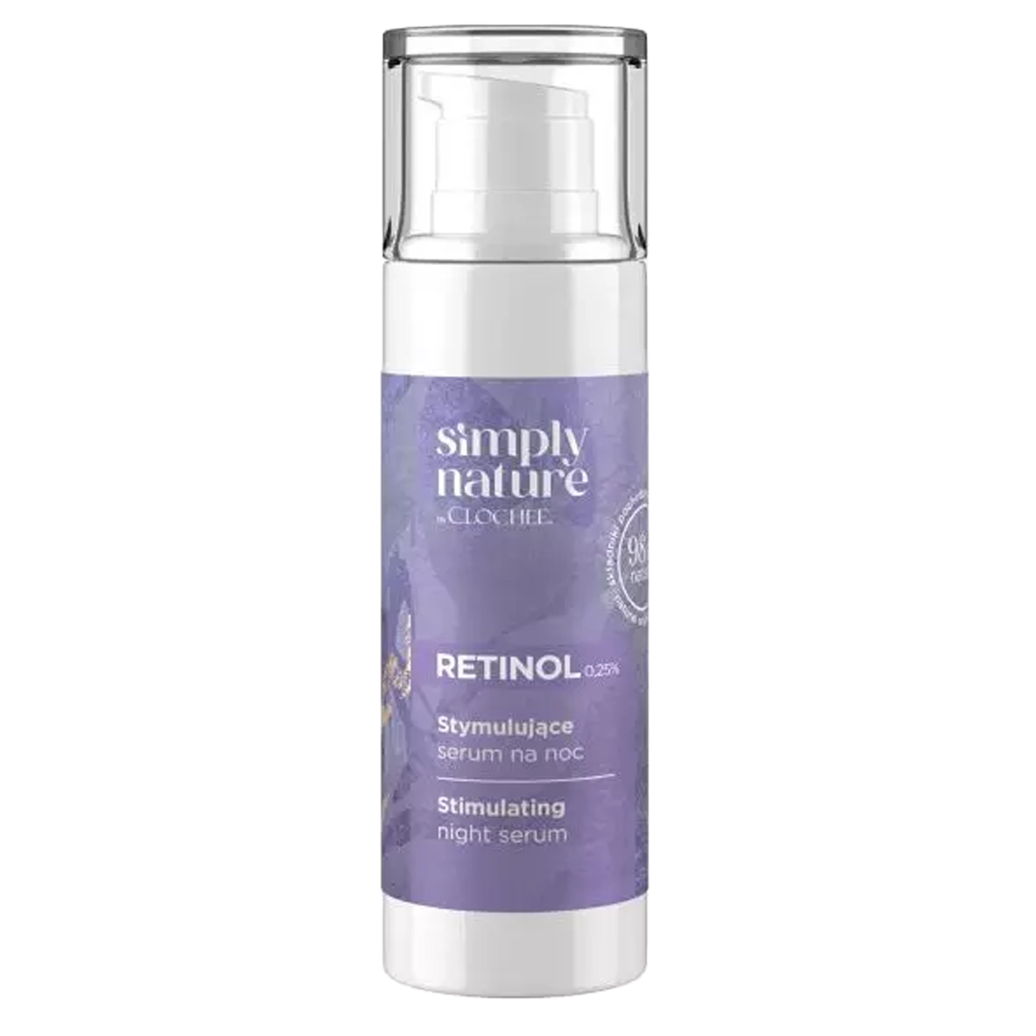Clochee - Simply Nature - Retinol Night Serum - serum stymulujące i wygładzające. Jego działanie oparte zostało na retinolu w stężeniu 0,25% i opracowanej technologii jego stopniowego uwalniania, dzięki której skutecznie zmniejsza widoczność zmarszczek, pobudza skórę do regeneracji i wyrównuje jej koloryt, a jednocześnie ma mniejszy potencjał drażniący. Za odpowiedni poziom nawilżenia skóry odpowiada dodany do składu kompleks nowej generacji Glycohyal LW i przynoszący komfort i wzmocnienie bariery hydrolipidowej olej sojowy. Regularne stosowanie produktu stopniowo przywraca skórze promienny wygląd i większą elastyczność. 98,8% składników produktu ma pochodzenie naturalne.