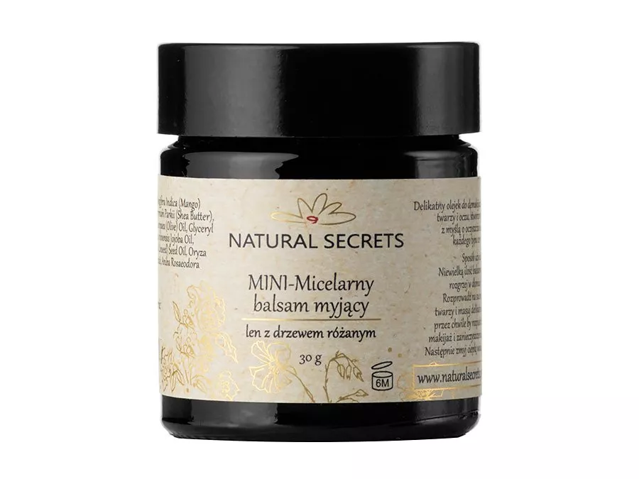 - Natural Secrets - Micelarny balsam myjący - to łagodny balsam do demakijażu w formie sorbetu, który nie wysusza skóry, jednocześnie bardzo skutecznie zmywa wszelkie zanieczyszczenia tj. tłuszcz, makijaż, a nawet grube warstwy wodoodpornych produktów z filtrami UV.