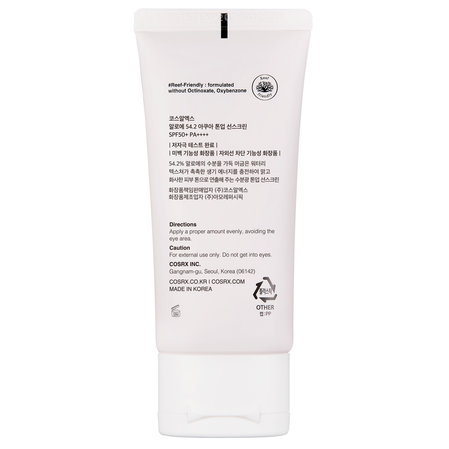 Cosrx - Aloe 54.2 Aqua Tone-Up Sunscreen SPF50+/PA++++ - krem do twarzy z filtrami UV zapewniającym wysoki stopień ochrony przed promieniowaniem słonecznym. Posiada wodnistą konsystencję, która przyjemnie rozprowadza się na skórze pozostawiając naturalne, nawilżające wykończenie bez uczucia lepkości. Skład został wzbogacony o kojący aloes, a także nawilżający hialuronian sodu. Dodatek witaminy E zapobiega przedwczesnemu starzeniu skóry. Produkt jest bezzapachowy.