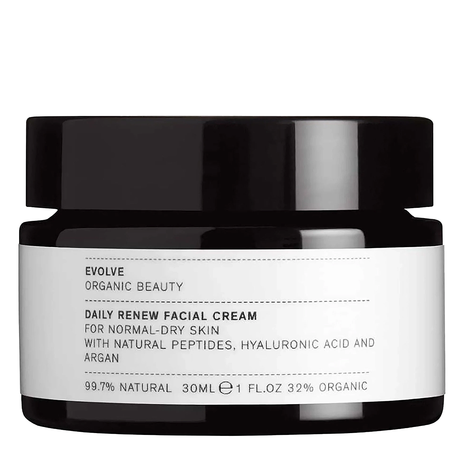 Evolve Organic Beauty - Daily Renew Natural Face Cream - głęboko nawilżający krem do skóry normalnej oraz suchej. Zawiera oleje i masła, które dzięki dużej zawartości fosfolipidów i kwasów tłuszczowych wzmacniają i regenerują barierę hydrolipidową. Olej arganowy uzupełnia lipidy w naskórku, masło shea i olej sezamowy tworzą ochronną barierę nieprzepuszczającą szkodliwych czynników zewnętrznych. Pod taką okluzją zawarty małocząsteczkowy kwas hialuronowy ma szansę penetrować skórę głębiej i jeszcze lepiej nawilżać. Produkt powstał ze składników pochodzenia naturalnego, jest odpowiedni dla wegan i zgodny z ideą less waste.