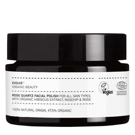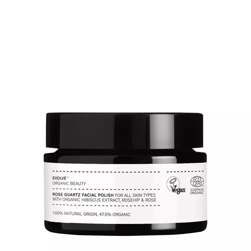 Evolve Organic Beauty - Rose Quartz Facial Polish - peeling do każdego rodzaju skóry, szczególnie dojrzałej i o nierównym kolorycie. Drobinki różowego kwarcu złuszczają martwy naskórek. Olej z nasion dzikiej róży oraz olej z kwiatów róży damasceńskiej zapobiegają nadmiernemu odparowywaniu wody, zmiękczają i łagodzą. Ekstrakt z kwiatów hibiskusa działa antyoksydacyjnie i rozjaśniająco. Jego działanie wspiera witamina E będąca silnym przeciwutleniaczem chroniącym przed działaniem wolnych rodników. Hydrolat ze słodkiej pomarańczy pomaga zwalczać bakterie i inne drobnoustroje, dodatkowo łagodzi zaczerwienienia. Produkt jest naturalny, odpowiedni dla wegan i zgodny z ideą less waste.