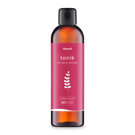 Fitomed - Tonik Cera Sucha - tonik ziołowy przeznaczony do porannej i wieczornej pielęgnacji skór suchych, wrażliwych oraz dojrzałych. Poza przywróceniem fizjologicznego pH skórze, ma dodatkowe właściwości łagodzące i nawilżające. Zawiera ziołowe ekstrakty: z lukrecji i prawoślazu. Działają one przeciwzapalnie, łagodząco i regenerująco. Z kolei ekstrakt z owsa dodatkowo uelastycznia i nawilża. Połączenie pantenolu i alantoiny zapewnia zminimalizowanie podrażnień, zmniejszenie utraty wody przez naskórek oraz zmiękczenie. Tonik ma wegańską formułę, która zawiera 98% składników pochodzenia naturalnego.