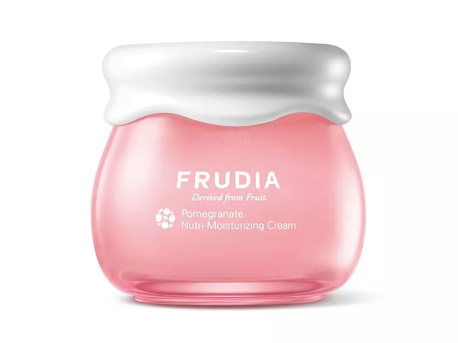 Frudia - Pomegranate Nutri-Moisturizing Cream - krem do codziennej pielęgnacji twarzy o działaniu odżywczo-nawilżającym. Otula skórę lekką, aksamitną formułą wzbogaconą m.in. o kolagen, hialuronian sodu i pantenol. Dzięki starannie dobranemu połączeniu składników aktywnych krem skutecznie wspiera prawidłowe nawilżenie skóry, łagodzi podrażnienia oraz wspomaga procesy regeneracyjne. Z kolei dodatek antyoksydacyjnego ekstraktu z owoców granatu chroni skórę przed szkodliwym działaniem wolnych rodników, spowalniając tym samym procesy starzenia. Całość formuły dopełnia adenozyna, która wspiera redukcję drobnych zmarszczek i jednocześnie poprawia jędrność oraz elastyczność skóry. Po zastosowaniu kremu skóra staje się wyraźnie miękka, odżywiona i wygładzona. Produkt zamknięty jest w uroczym, różowym słoiczku.