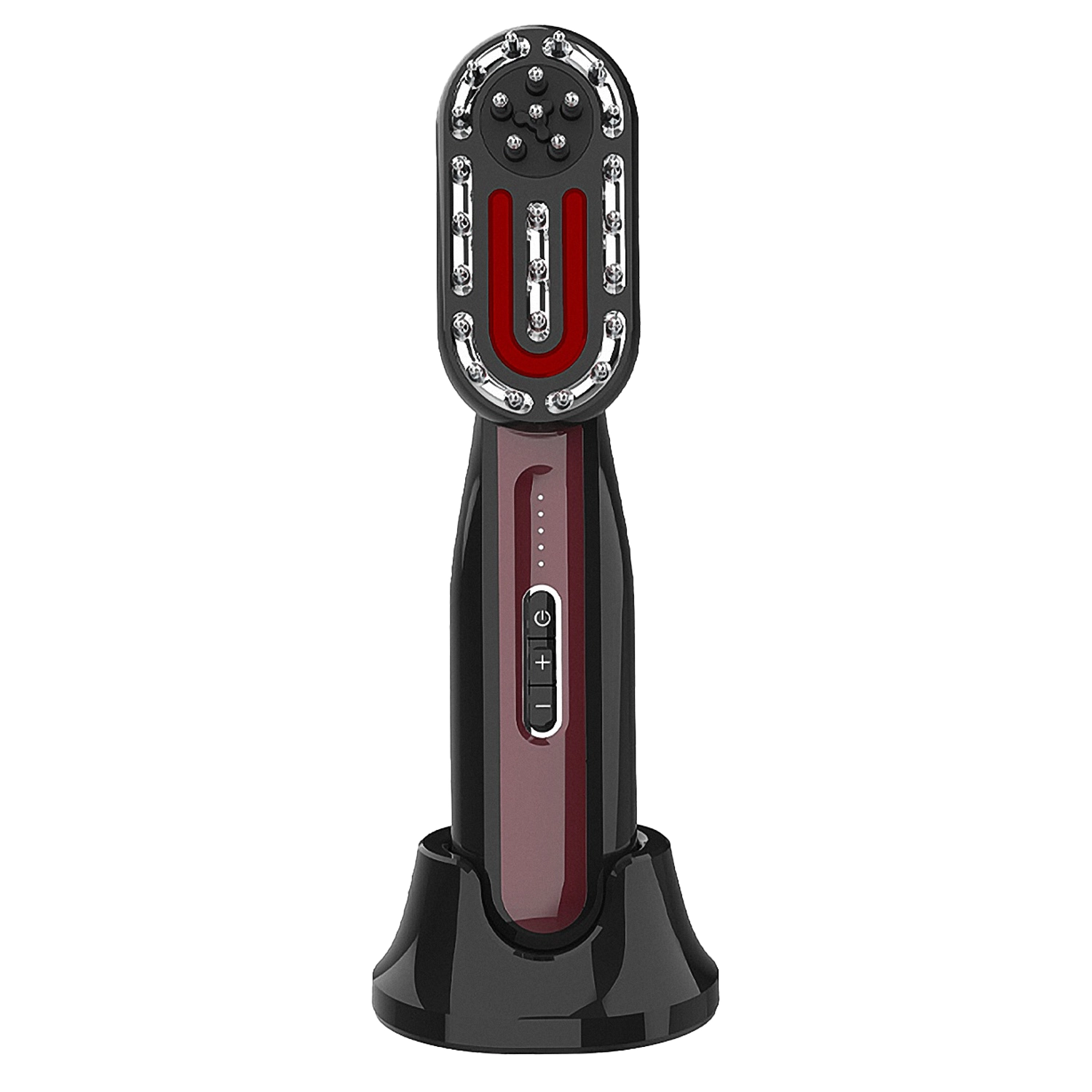 Sposób aplikacji: 1. Pielęgnacja włosów i skóry głowy: Aby włączyć urządzenie, naciśnij i przytrzymaj przycisk zasilania do momentu wyczucia wibracji. Urządzenie uruchomi się automatycznie w Trybie 1, czyli na najniższym poziomie mocy. Zmianę trybu pracy uzyskasz poprzez krótkie naciśnięcie przycisku włączania. Aby wyłączyć urządzenie, ponownie przytrzymaj przycisk, aż poczujesz wibracje. Przycisk "+" służy do stopniowego zwiększania mocy (od poziomu 1 do 5), natomiast przycisk "-" umożliwia jej zmniejszanie (od poziomu 5 do 1). Przed rozpoczęciem zabiegu upewnij się, że skóra głowy jest czysta i sucha, a włosy dokładnie rozczesane. Podczas używania głowicy szczotki przesuwaj jej zęby powoli po skórze głowy, wykonując delikatne ruchy zygzakowe. Zabieg rozpocznij od najniższego poziomu mocy i stopniowo go zwiększaj, dostosowując intensywność do własnego komfortu. Zadbaj o to, aby wszystkie metalowe zęby szczotki miały stały kontakt ze skórą głowy, jednak unikaj zbyt mocnego nacisku, który mógłby powodować podrażnienia lub uszkodzenia skóry. Szczotkę prowadź pionowo, wzdłuż skóry głowy, stosując umiarkowany nacisk. Zabieg na skórę głowy zaleca się wykonywać co 2-3 dni, a jego czas nie powinien przekraczać 5 minut. Podczas każdego użycia zwróć uwagę, aby masować wszystkie obszary skóry głowy, co umożliwi skuteczne działanie czerwonego i niebieskiego światła, docierającego równomiernie do całej powierzchni skóry. Przy pierwszym użyciu zaleca się rozpoczęcie od najniższego trybu pracy, a następnie stopniowe dostosowywanie ustawień do indywidualnych potrzeb. 2. Pielęgnacja twarzy: Na dokładnie oczyszczoną skórę twarzy nałóż serum, ampułkę lub inny kosmetyk o właściwościach przewodzących. Następnie włącz urządzenie, wybierając tryb pracy odpowiedni do swoich potrzeb, rozpoczynając od najniższego poziomu mocy. Intensywność działania zwiększaj stopniowo, aż do momentu uzyskania komfortowych odczuć. Przyłóż głowicę do skóry twarzy w taki sposób, aby całą powierzchnią przylegała do skóry, a następnie powoli przesuwaj ją od środka twarzy ku zewnętrznym partiom, wykonując płynne i delikatne ruchy. Podczas zabiegu należy unikać okolic oczu, ust, nosa oraz obszaru tarczycy. Zabieg pielęgnacyjny na twarz zaleca się wykonywać w seriach od 6 do 10 sesji, co 2-3 dni. Czas jednorazowego zabiegu nie powinien przekraczać 10 minut. 3. Pielęgnacja ciała: Na czystą skórę nałóż serum, ampułkę lub inny kosmetyk o właściwościach przewodzących, co pozwoli zintensyfikować efekty zabiegu. Następnie włącz urządzenie i przyłóż głowicę do wybranego obszaru ciała. Zabieg rozpocznij od najniższego poziomu mocy, stopniowo zwiększając intensywność do momentu, w którym odczucia pozostają w pełni komfortowe. Podczas wykonywania zabiegu przesuwaj głowicę od dołu ku górze, w kierunku serca. W przypadku okolic brzucha wykonuj delikatne ruchy okrężne, prowadząc głowicę od zewnętrznych partii w stronę pępka. Zwróć uwagę, aby elektroda przez cały czas ściśle przylegała do skóry, co zapewni skuteczne i bezpieczne działanie urządzenia.