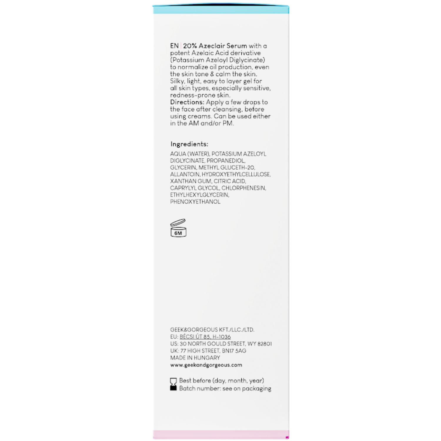 Geek & Gorgeous - aPAD - serum ze związkiem Azeclair zawierającym azeloglicynę, będącą połączeniem glicyny i kwasu azelainowego. Wykazuje działanie antybakteryjne i przeciwzapalne, dzięki czemu zmniejsza objawy trądziku, reguluje pracę gruczołów łojowych, a także nawilża, rozjaśnia przebarwienia i redukuje wrażliwość skóry. Alantoina dodatkowo łagodzi podrażnienia. Produkt odpowiedni do każdego typu cery, która ma skłonność do wykwitów zapalnych, podrażnień, przebarwień czy nadmiernego wydzielania sebum. Ma lekką, żelową formułę, która szybko się wchłania i pH w zakresie 5,5-6,5. Kosmetyk ma wegańską formułę.