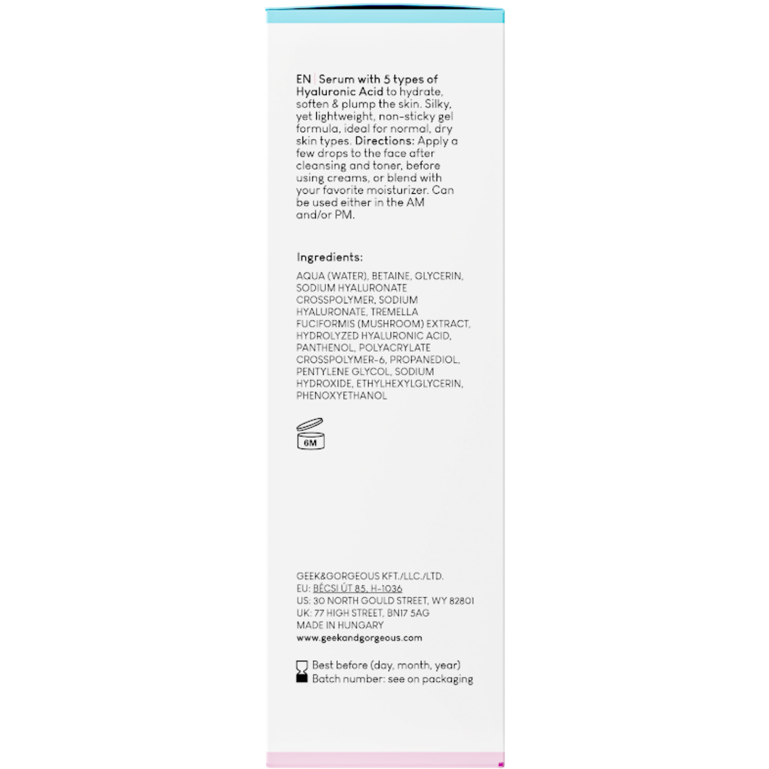 Geek & Gorgeous - HA 5 Rich - serum z 5 formami kwasu hialuronowego, który intensywnie nawilża, napina i wygładza skórę. Zostało wzbogacone o ekstrakt z grzyba - trzęsaka morszczynowatego o działaniu nawilżającym i antyoksydacyjnym oraz pantenol, który niweluje podrażnienia skóry. Serum zapewnia skórze odpowiednie nawilżenie, wzmacnia barierę ochronną skóry i zmiękcza naskórek. Ma gładką, żelową konsystencję, która nie pozostawia uczucia lepkości. Najlepiej sprawdza się do skóry suchej i normalnej. Ma pH równe 4,5-5,5. Kosmetyk jest wegański.