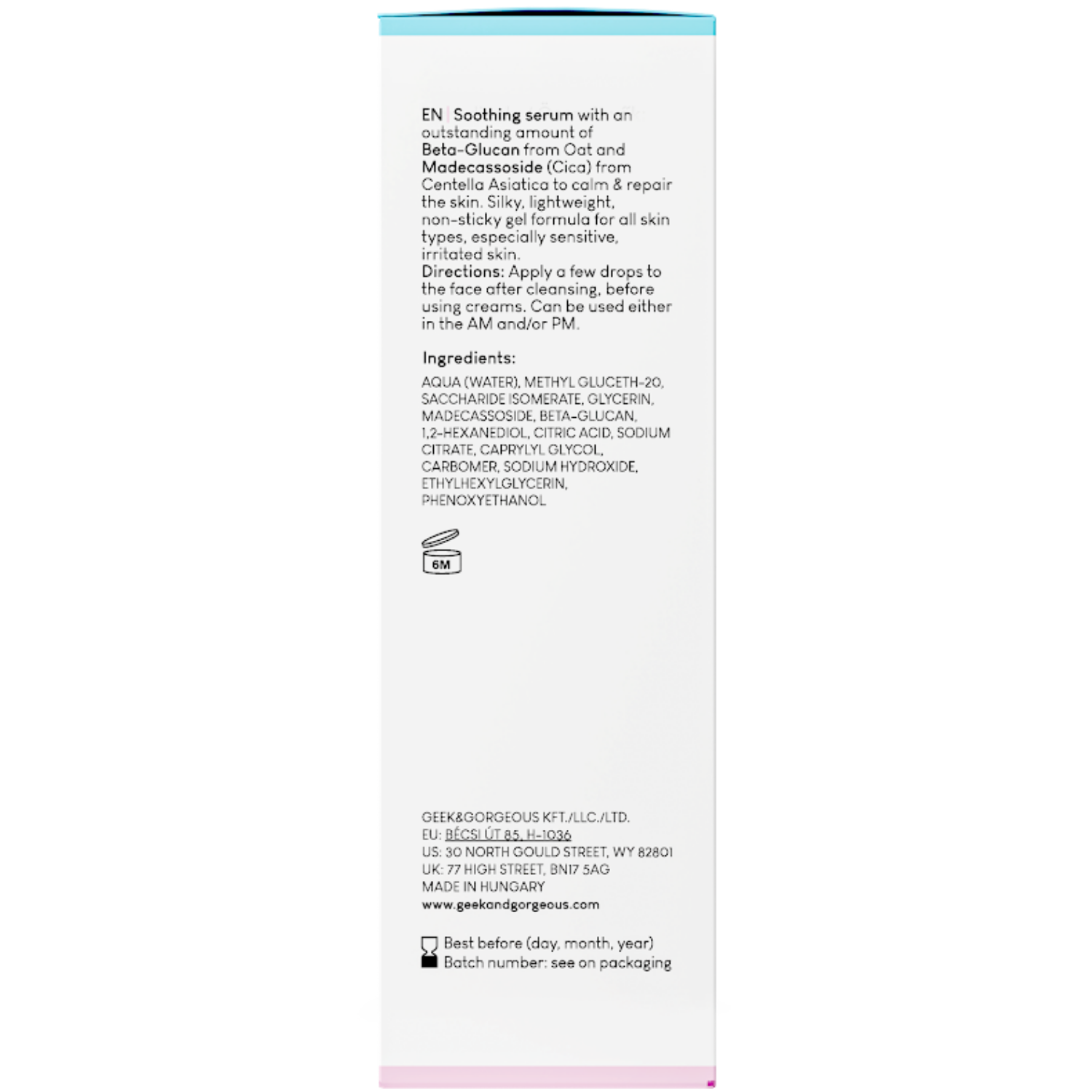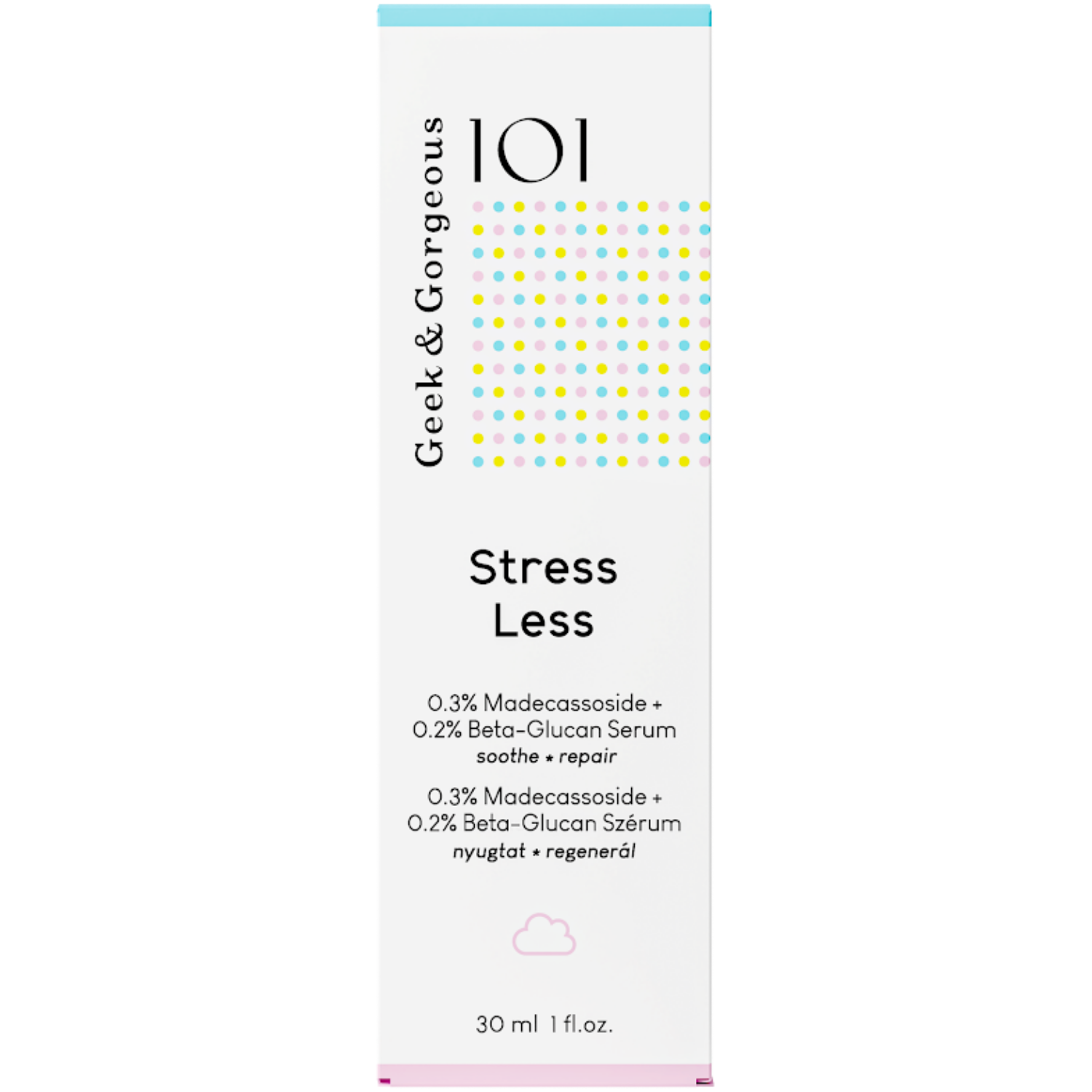 Geek & Gorgeous - Stress Less Beta Glukan + Madecassoside - 0.5% - żelowe serum z beta-glukanem i madekasozydem jest idealnym produktem do odbudowy bariery hydrolipidowej skóry. Beta-glukan działa silnie odżywczo i regenerująco, nawilża zarówno dogłębnie jak i tworzy warstewkę na powierzchni skóry zapobiegając odwodnieniu. Madekasozyd z wąkroty azjatyckiej cechuje się działaniem silnie regenerującym, łagodzącym i przeciwzapalnym. Dodatkowo reguluje produkcję melaniny oraz działa przeciwutleniająco. Kosmetyk jest wegański.