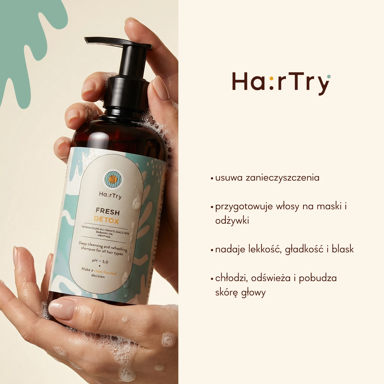 HairTry - Fresh Detox - szampon detoksykujący o lekkiej, żelowej konsystencji. Stworzony na bazie nowoczesnego środka chelatującego (Tetrasodium Glutamate Diacetate), by dokładnie oczyszczać skórę głowy i włosy z nadbudowy minerałów, metali ciężkich i pozostałości kosmetyków. Świetnie sprawdzi się do zwiększania efektów domowych zabiegów pielęgnacyjnych, dzięki usprawnianiu wchłaniania składników odżywczych. Zastosowane emolienty glicerynowe z oleju babassu wyraźnie wygładzają, zwiększają sprężystość i miękkość włosów, a za dodatkowe działanie łagodzące, przyjemne odświeżenie i chłodzenie odpowiada dodany do formuły mentol. Szampon sprawdzi się w pielęgnacji każdego rodzaju włosów, dzięki opracowaniu balansu pomiędzy właściwościami oczyszczającymi a pielęgnującymi. Dla najlepszych efektów polecamy stosowanie go przed koloryzacją i zabiegami pielęgnacyjnymi. Po umyciu włosów szamponem chelatującym należy zadbać o intensywniejsze nawilżenie pasm, na przykład za pomocą odżywki HairTry - Everyone, Everyday.