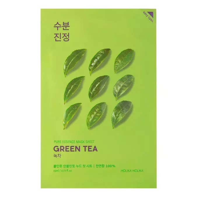 Holika Holika - Pure Essence Mask Sheet - Green Tea - maska jest wykonana z cienkiego płata bawełny nasączonego cennymi składnikami aktywnymi, który idealnie dopasowuje się do kształtu twarzy. Zawiera wyciąg z zielonej herbaty o działaniu przeciwzapalnym, antyoksydacyjnym i delikatnie ściągającym oraz ekstrat z wąkroty azjatyckiej, która łagodzi i pobudza procesy regeneracji naskórka. W produkcie nie zabrakło także betainy i pantenolu, które skutecznie podnoszą nawilżenie skóry oraz alantoiny, która koi i łagodzi podrażnienia. Po zdjęciu maski skóra jest odświeżona i nawilżona, dlatego sprawdzi się w szczególności do skóry mieszanej, odwodnionej.