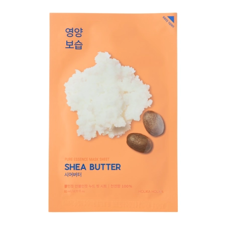 Holika Holika - Pure Essence Mask Sheet - Shea Butter - maska w płachcie zawierająca masło shea, które wygładza skórę oraz zapobiega utracie wody z naskórka. Alantoina koi i łagodzi podrażnienia, a hialuronian sodu wiąże wodę, utrzymując odpowiedni poziom nawilżenia skóry. Dodatkowo, obecny w produkcie ekstrakt z wąkroty azjatyckiej łagodzi podrażnienia, wspomaga procesy gojenia i regeneracji. Z kolei ekstrakt z korzenia piwonii białej działa antyoksydacyjnie, a także wygładza i uelastycznia skórę.