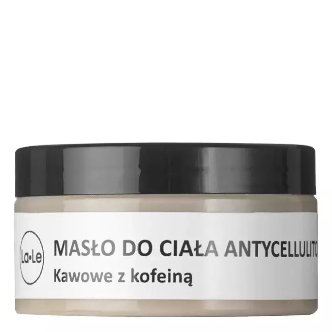 La-Le - Antycellulitowe Masło do Ciała - Kawowe z Kofeiną - masło do ciała o działaniu skoncentrowanym na walce z cellulitem. Zwiększenie elastyczności i jędrności skóry jest możliwe dzięki zawartości ekstraktu z nasion kawy, który ma właściwości antycellulitowe. Olej z nasion kawy dodatkowo zmiękcza naskórek i wygładza, a kofeina pobudza mikrokrążenie co istotnie wpływa na fizjologię skóry oraz prawidłowe układanie się komórek tłuszczowych, które jest odpowiedzialne za odpowiednią teksturę skóry.