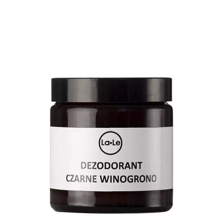 La-Le - Dezodorant - Czarne Winogrono - dezodorant skomponowany na bazie oleju kokosowego, który wykazuje właściwości ochronne i antybakteryjne oraz odżywia skórę. Zawiera sodę oczyszczoną, która neutralizuje bakterie odpowiedzialne za przykry zapach oraz skrobię i ziemię okrzemkową, które wiążą krople potu i pochłaniają nadmiar wilgoci pod pachami.