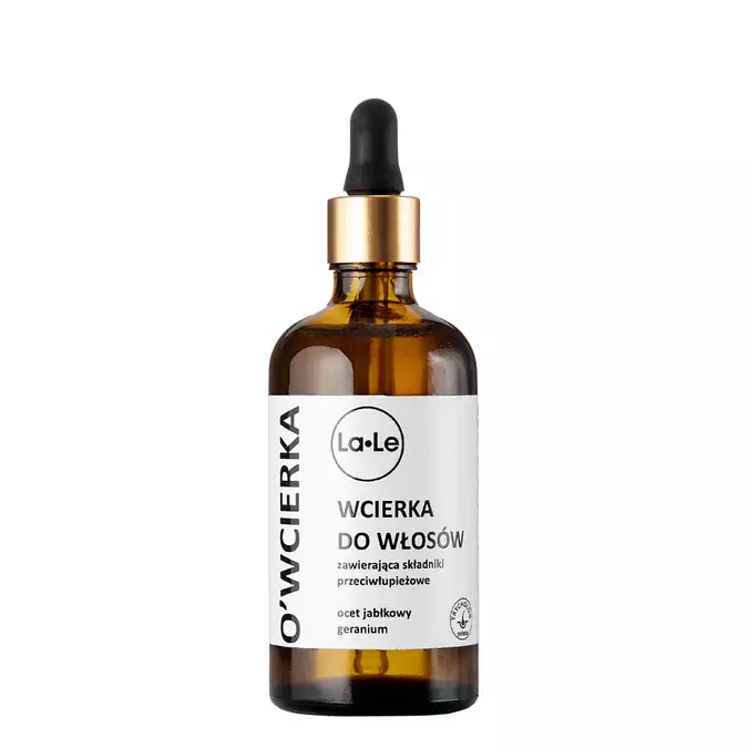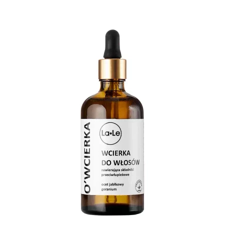 La-Le - Wcierka do Włosów z Geranium - wcierka do włosów bazująca na occie jabłkowym z dodatkiem hydrolatu oraz olejku geraniowego. Odświeża skórę głowy, tonizuje, działa przeciwzapalnie, hamuje nadmierne przetłuszczanie włosów oraz wspomaga zwalczanie łupieżu. Przeznaczona szczególnie do włosów z problemem szybkiej produkcji sebum, łupieżu, czy stanami zapalnymi i podrażnieniem skóry głowy.