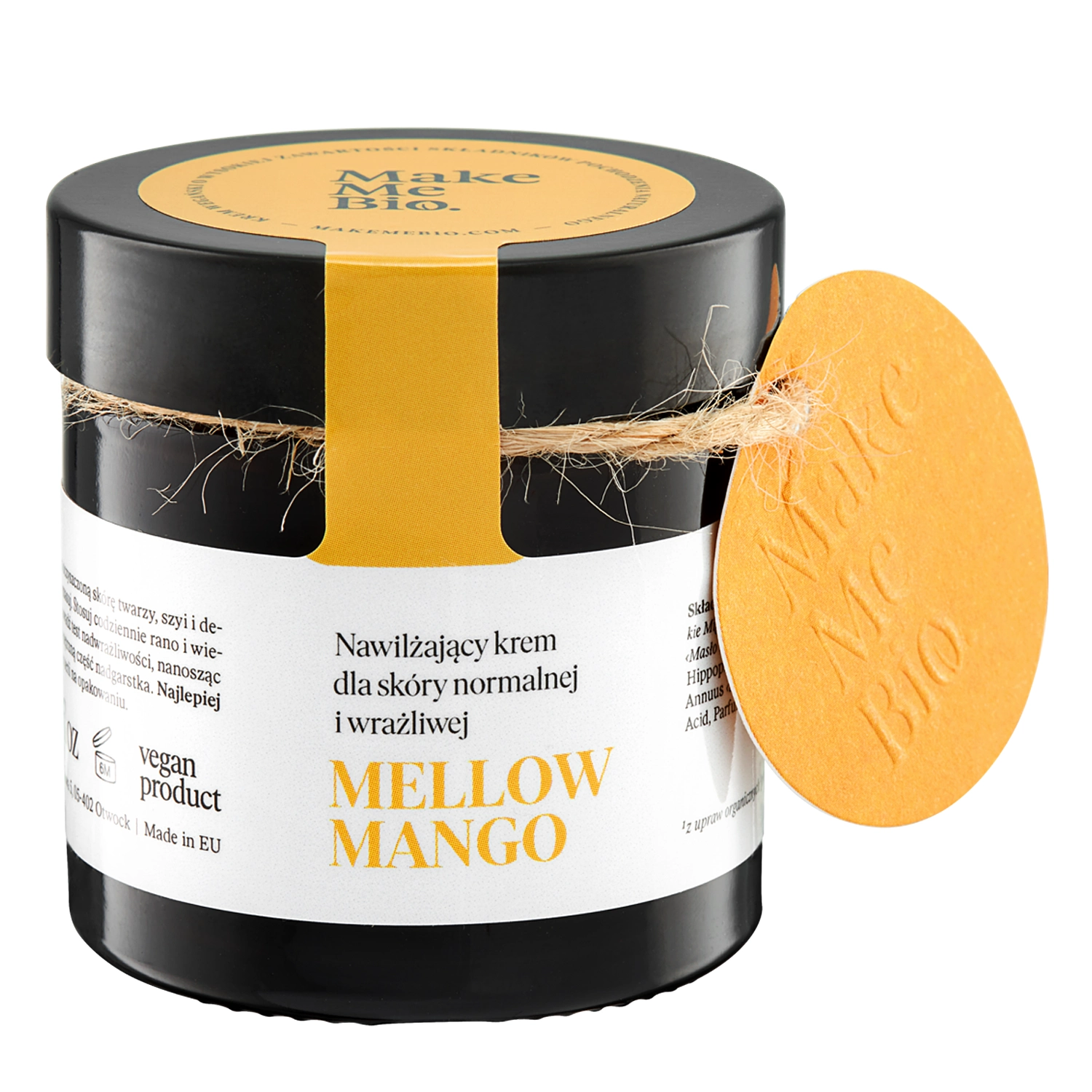 Make Me Bio - Mellow Mango - krem do twarzy na bazie oleju ze słodkich migdałów, który zabezpiecza skórę przed utratą wody oraz oleju jojoba, który działa odżywczo i regeneruje skórę. Krem zawiera masło mango, które stanowi ochronę przed czynnikami zewnętrznymi oraz jest źródłem nienasyconych kwasów tłuszczowych, niezbędnych do prawidłowego funkcjonowania bariery hydrolipidowej. Dodatek oleju z rokitnika działa antyoksydacyjnie i odżywczo, a witamina E jest przeciwutleniaczem oraz dba o odpowiednie nawilżenie skóry. Produkt posiada delikatny aromat mango.
