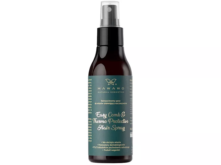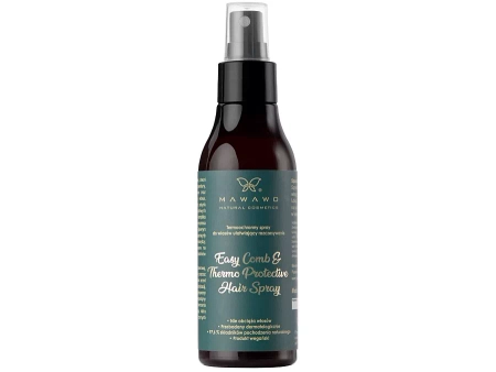 Mawawo - Easy Comb & Thermo Protective Hair Spray - Termoochronny Spray do Włosów Ułatwiający Rozczesywanie - chroni włosy przed działaniem wysokich temperatur i czynników zewnętrznych oraz ułatwia ich rozczesywanie. Produkt zawiera ekstrakt z alg Cystoseira compressa (Esper)Gerloff & Nizamuddin osadzony na matrycy z amylopektyny kukurydzy, regeneruje włókna keratyny, poprawia integralność warstwy korowej włosów, wzmacnia i podkreśla połysk, chroni przed wysoką temperaturą oraz ułatwia rozczesywanie. Równie cennym składnikiem tego produktu jest HydrafenceTM, czyli ekstrakt z alg Lithothamnion Calcareum oraz amylopektyny ryżu, który zapobiega ucieczce wody, chroni przed czynnikami zewnętrznymi, a także ułatwia rozczesywanie. Produkt skutecznie chroni włosy przed działaniem temperatury do 180°C oraz zwiększa ich połysk. Powstał ze składników pochodzenia naturalnego i jest odpowiedni dla wegan.