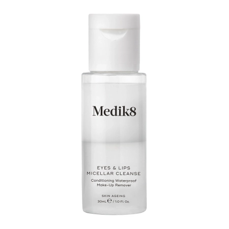Medik8 - Try Me Size - Eyes & Lips Micellar Cleanse - płyn do demakijażu z trójfazową technologią micelarną umożliwiającą skuteczne usuwanie nawet wodoodpornego makijażu. Formuła została wzbogacona o nawilżający pantenol i hialuronian sodu oraz hydrolaty z rumianku i bławatka, które działają przeciwzapalnie i łagodząco. Produkt delikatnie, ale skutecznie oczyszcza skórę wokół oczu i ust z makijażu i zanieczyszczeń. Odpowiedni jest do stosowania również w przypadku wrażliwych oczu i osób noszących soczewki kontaktowe. Produkt nie jest przeznaczony dla osób noszących sztuczne rzęsy. Produkt less waste i odpowiedni dla wegan.