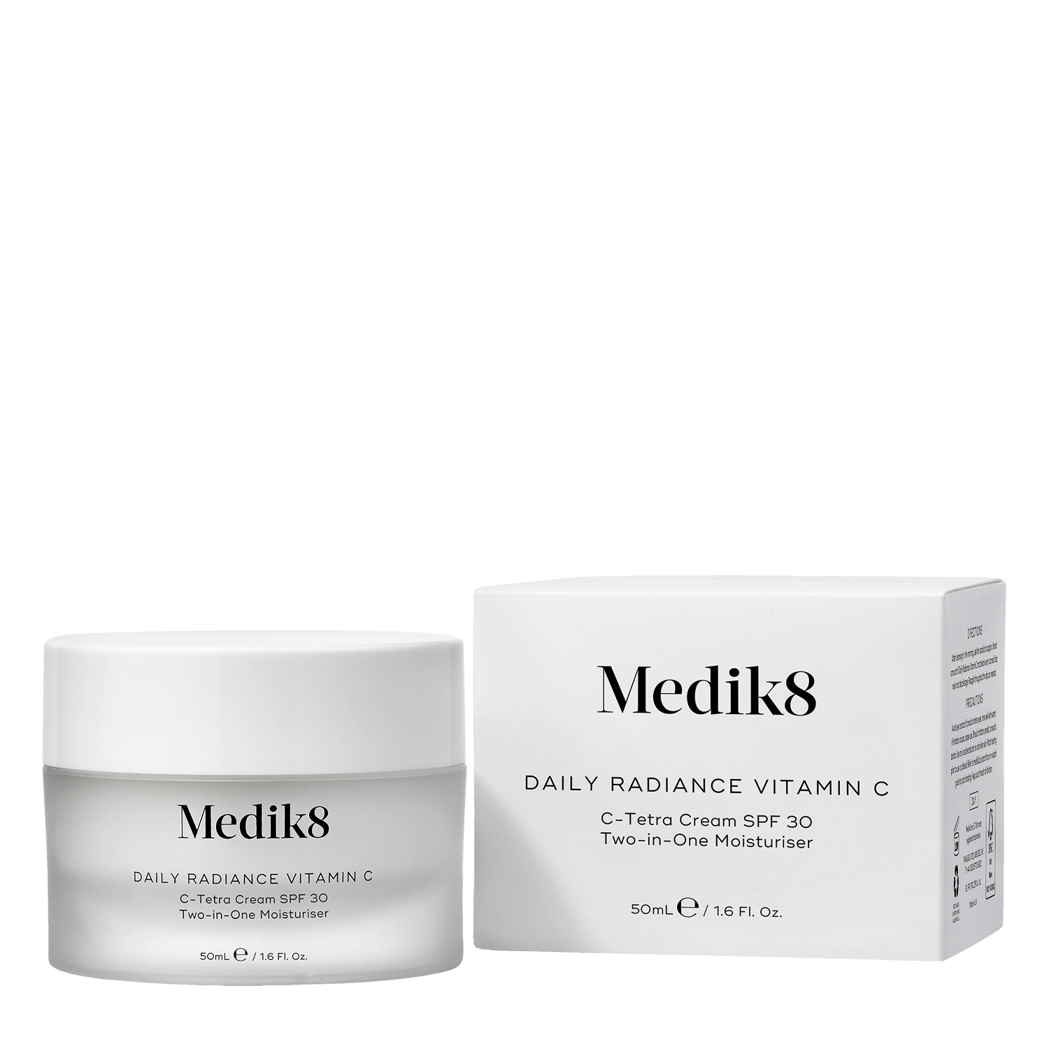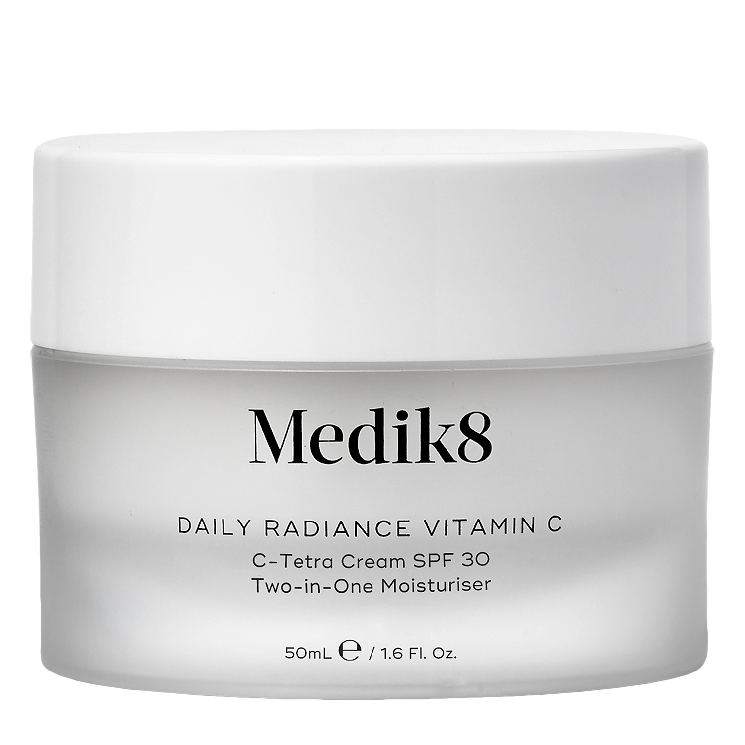 Medik8 - Daily Radiance Vitamin C - C-Tetra Cream SPF30 - krem chroniący skórę przed destrukcyjnym wpływem promieni UV. Zawiera filtry chemiczne, które pochłaniają część światła i zapobiegają jego penetrowaniu warstw skóry. Ponadto krem posiada w składzie antyoksydacyjne witaminy C i E, chroniące skórę przed wolnymi rodnikami i również zapobiegające fotostarzeniu. Dodatek substancji nawilżających: gliceryny i hialuronianu sodu dba o odpowiednie nawodnienie naskórka. Krem może okazać się odpowiedni u każdego rodzaju cery. Ochrona przeciwsłoneczna jest nam potrzebna codziennie, nawet w okresie zimowym oraz wtedy kiedy jesteśmy w pomieszczeniach, gdyż promienie UV przechodzą przez szyby okien. Produkt jest less waste i odpowiedni dla wegan.