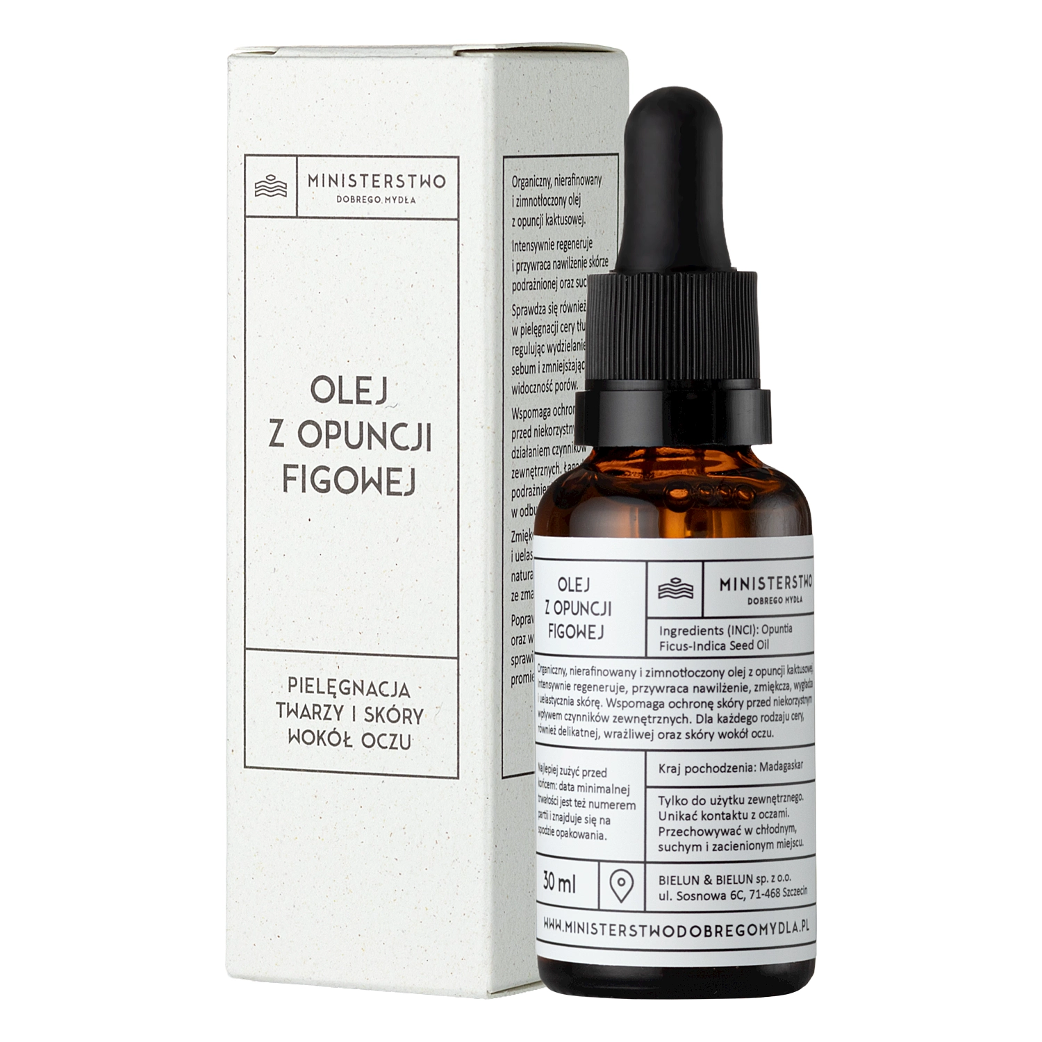 Ministerstwo Dobrego Mydła - Olej z Opuncji Figowej - 100% olej pozyskiwany z nasion opuncji figowej na Madagaskarze. Jest jednym z bardziej cenionych olejów w kosmetyce. Pozytywnie wpływa na elastyczność i jędrność skóry oraz szybko się w nią wchłania. Poza tym, jak na naturalny olej przystało - intensywnie odżywia i wygładza skórę. Zawiera cenne kwasy tłuszczowe potrzebne do odpowiedniego funkcjonowania bariery hydrolipidowej naskórka oraz związki antyoksydacyjne, które spowalniają procesy starzenia. Produkt jest opakowany w szklaną, przyciemnioną buteleczkę z dołączonym dozownikiem w formie pipety. Kosmetyk naturalny.