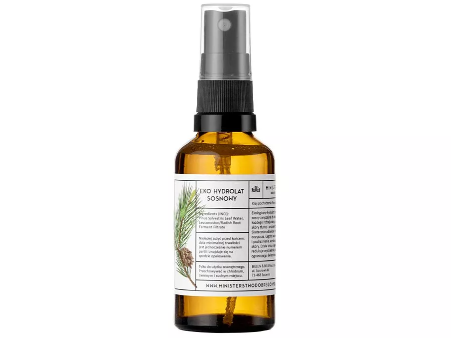 Ministerstwo Dobrego Mydła - Hydrolat Ekologiczny Sosna - hydrolat pozyskiwany z sosny zwyczajnej, który odświeża i łagodzi. Koi podrażnienia i zaczerwienienia, dzięki czemu sprawdzi się również po goleniu. Działa lekko ściągająco, redukuje wydzielanie potu i sebum, ograniczając świecenie się skóry. Sprawdzi się przede wszystkim u skór tłustych i mieszanych. Produkt jest zgodny z ideą less waste i w 100% naturalny - jego zapach, kolor i konsystencja mogą się więc nieznacznie różnić w zależności od partii, posiada również charakterystyczny zapach.