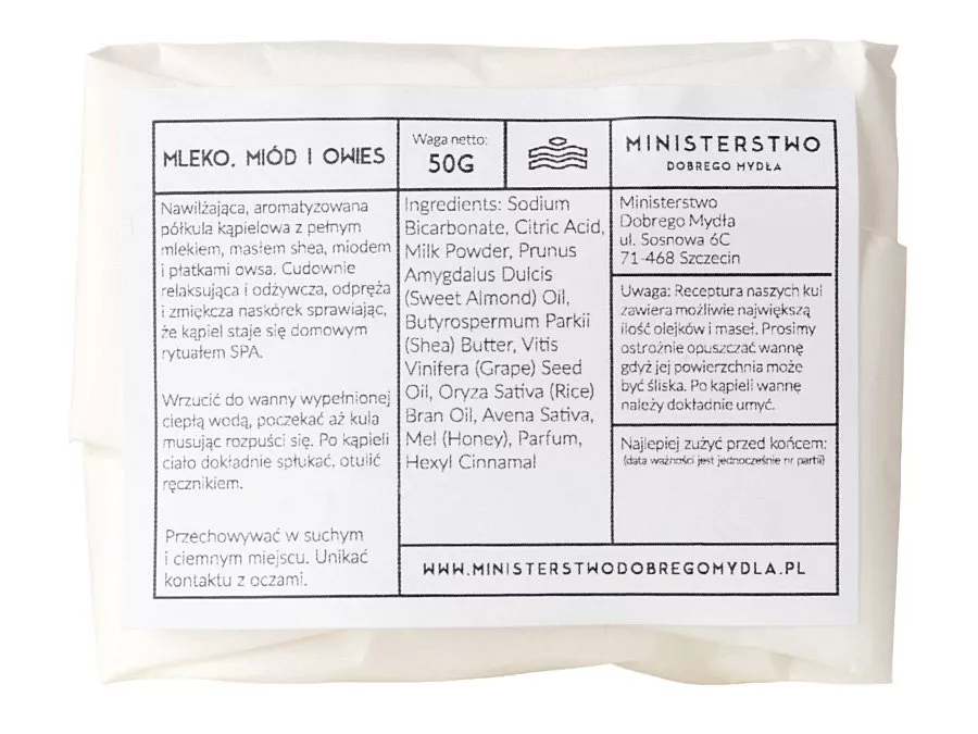 Ministerstwo Dobrego Mydła - Półkula do Kąpieli Mleko-Miód-Owies - półkula o słodkim zapachu. Półkula do kąpieli zawiera m.in. masło shea, które silnie odżywia i regeneruje skórę. Olej ze słodkich migdałów, olej ryżowy i olej z pestek winogron zapobiegają przed utratą wody z naskórka natłuszczają skórę, mleko będzie działało łagodząco, a miód i owies nawilżająco. Po kąpieli skóra staje się odżywiona, nawilżona oraz gładka i nie potrzebuje użycia balsamu. Produkt powstał ze składników pochodzenia naturalnego i jest zgodny z ideą less waste.