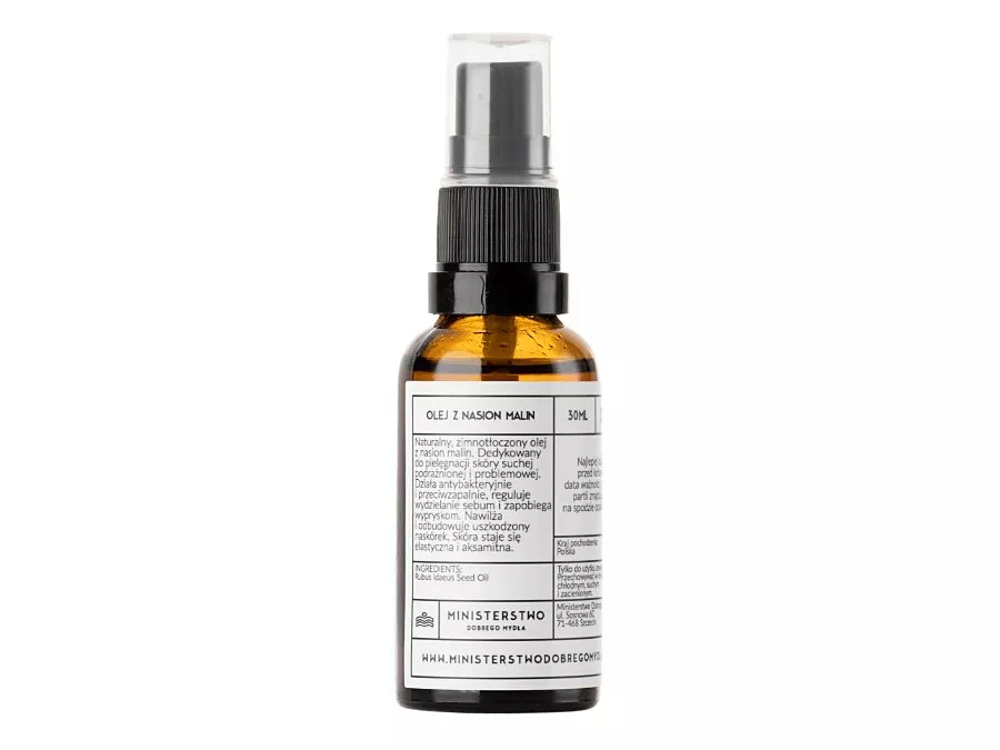 Ministerstwo Dobrego Mydła - Olej z Pestek Malin - zimnotłoczony olej z pestek owoców malin z rodzaju Rubus Idaeus. Zawiera wysoką ilość kwasów tłuszczowych (NNKT) takich jak: kwas linolowy i alfa-linolenowy. Dedykowany przede wszystkim skórze podrażnionej, przesuszonej i skłonnej do alergii. Łagodzi, uelastycznia i odbudowuje uszkodzoną warstwę naskórka. Produkt jest zgodny z ideą less waste i w 100% naturalny - jego zapach, kolor i konsystencja mogą się więc nieznacznie różnić w zależności od partii.