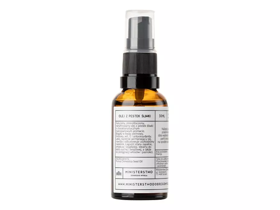 Ministerstwo dobrego mydła - Olej z Pestek Śliwki - nierafinowany olej śliwkowy to bogate źródło witamin E i B, beta-karotenu i kwasów NNKT. Produkt działa nawilżająco i odżywczo, sprawdzi się u osób ze skórą suchą i odwodnioną, a także trądzikowej. Jest źródłem kwasu oleinowego i linolowego, a także antyoksydantów, więc działa także przeciwstarzeniowo i regenerująco. Olej pozostawia delikatną warstwę ochronną na powierzchni skóry. Posiada delikatny zapach marcepanu. Można go używać także do olejowania włosów. Produkt jest zgodny z ideą less waste i w 100% naturalny - jego zapach, kolor i konsystencja mogą się więc nieznacznie różnić w zależności od partii.
